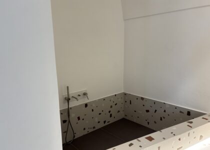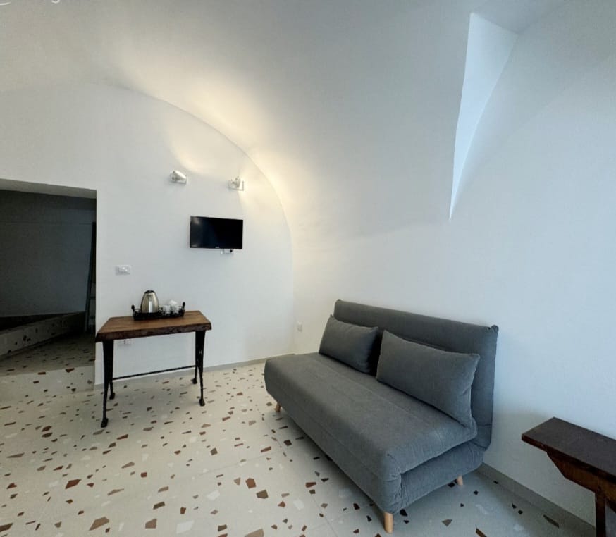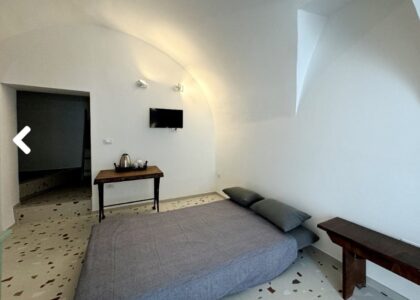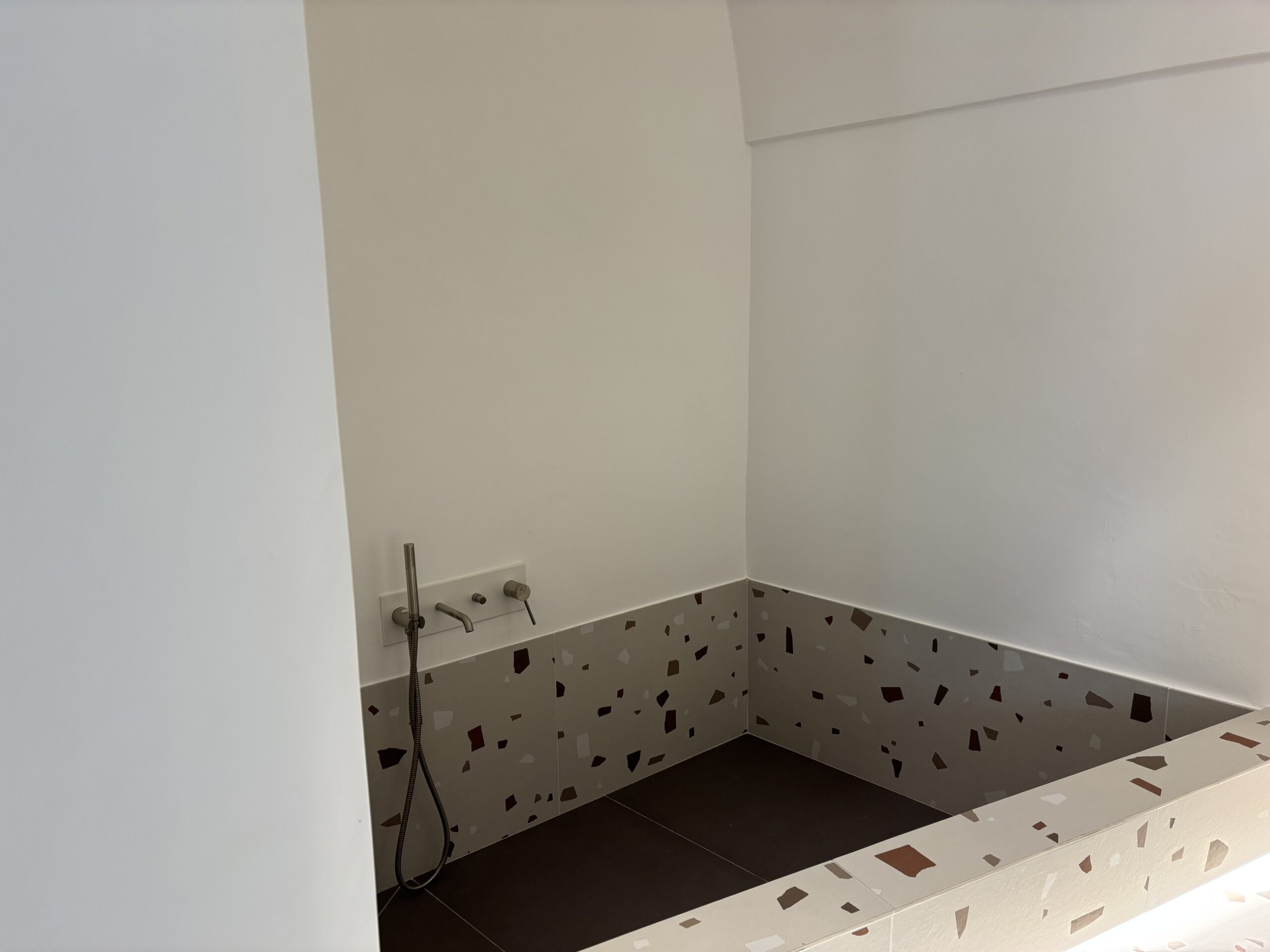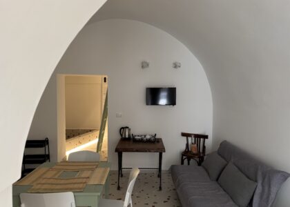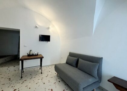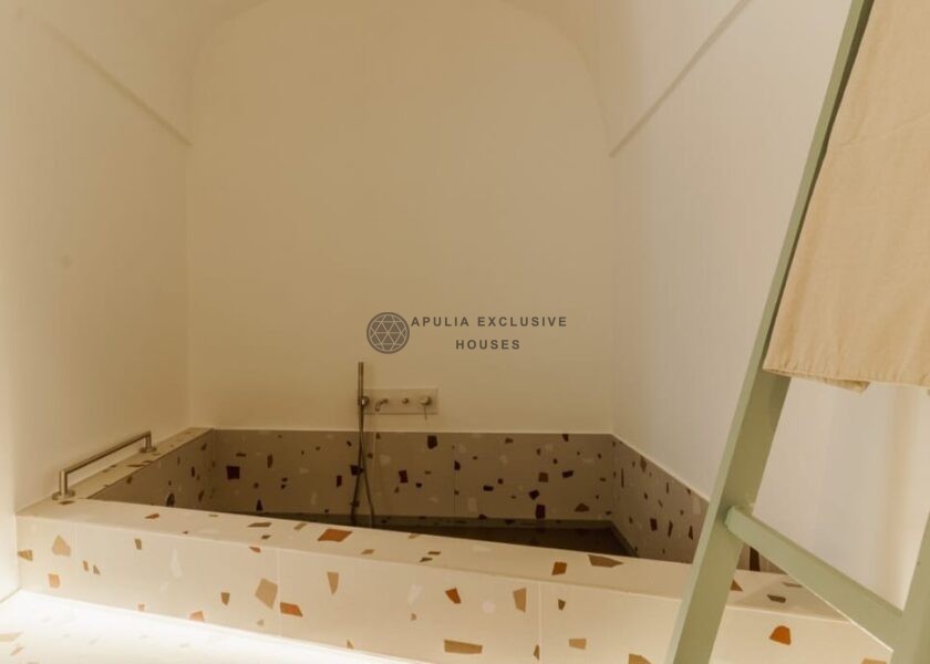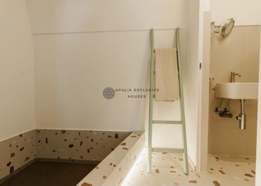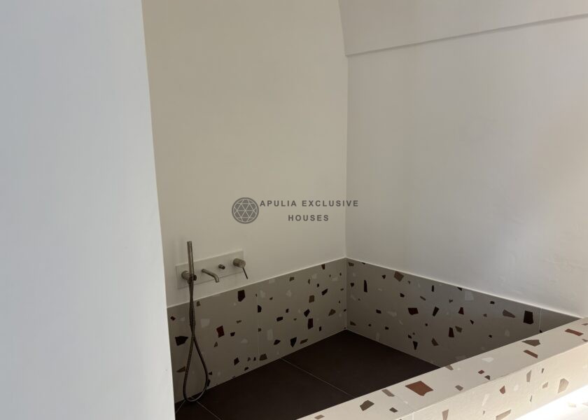 Ground Floor: Entrance into a spacious open-plan living area with a fitted kitchen and lounge. In the hallway leading to the bathroom, there is a large bathtub perfectly integrated into the home’s design, ideal for creating a private and stylish relaxation area. The vaulted stone ceilings (“volte a stella”) give the house an authentic and welcoming atmosphere.