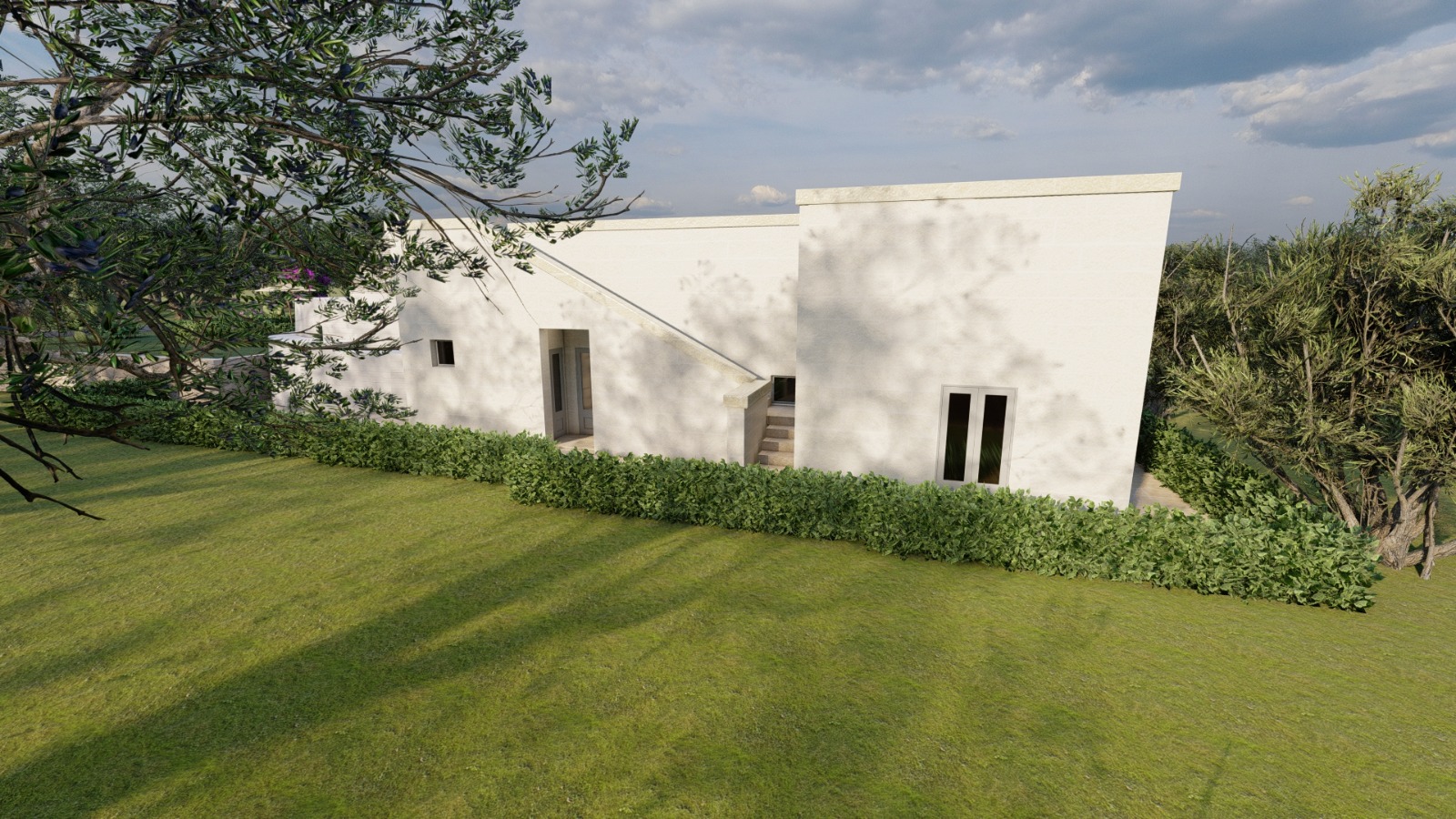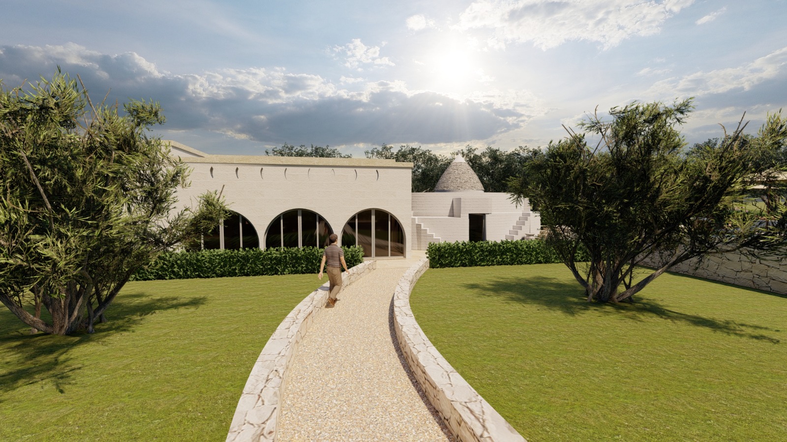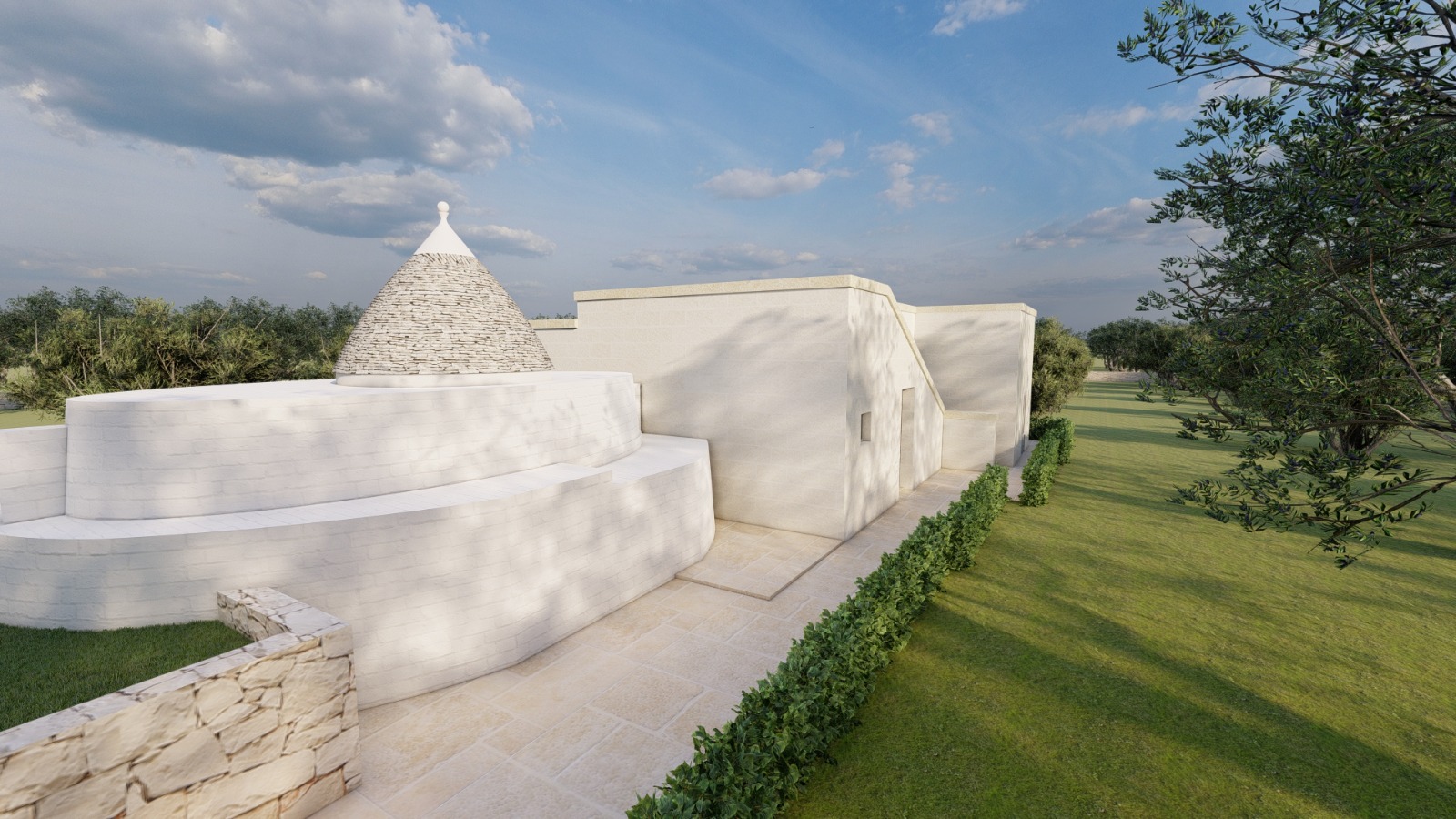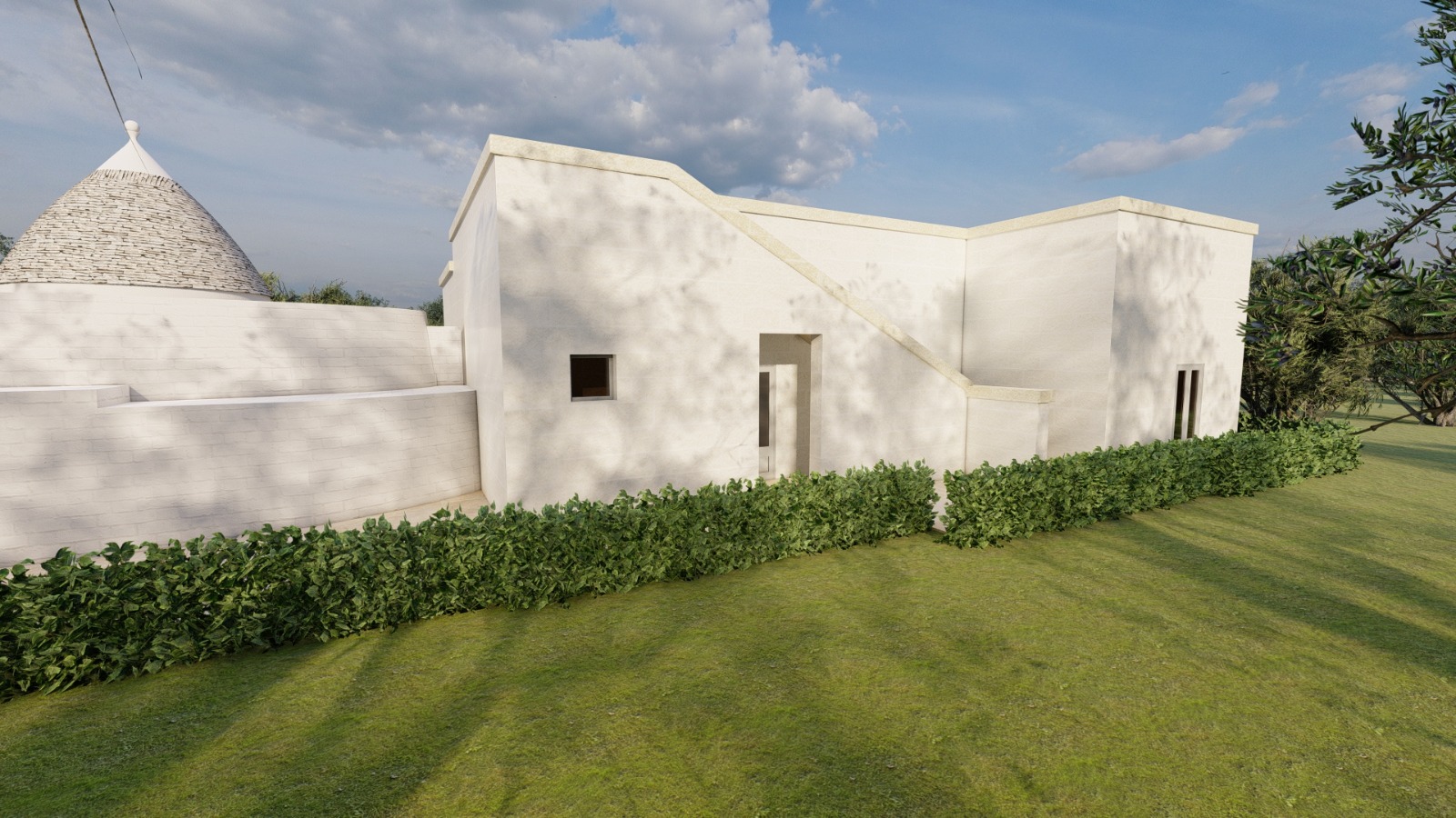 The approved project includes the careful restoration of the original trullo, along with the creation of an elegant and functional extension. Inside the trullo, there is a bedroom with a private bathroom, internally connected to the new building which comprises a spacious living room with an open-plan kitchen, two bedrooms, and two bathrooms.