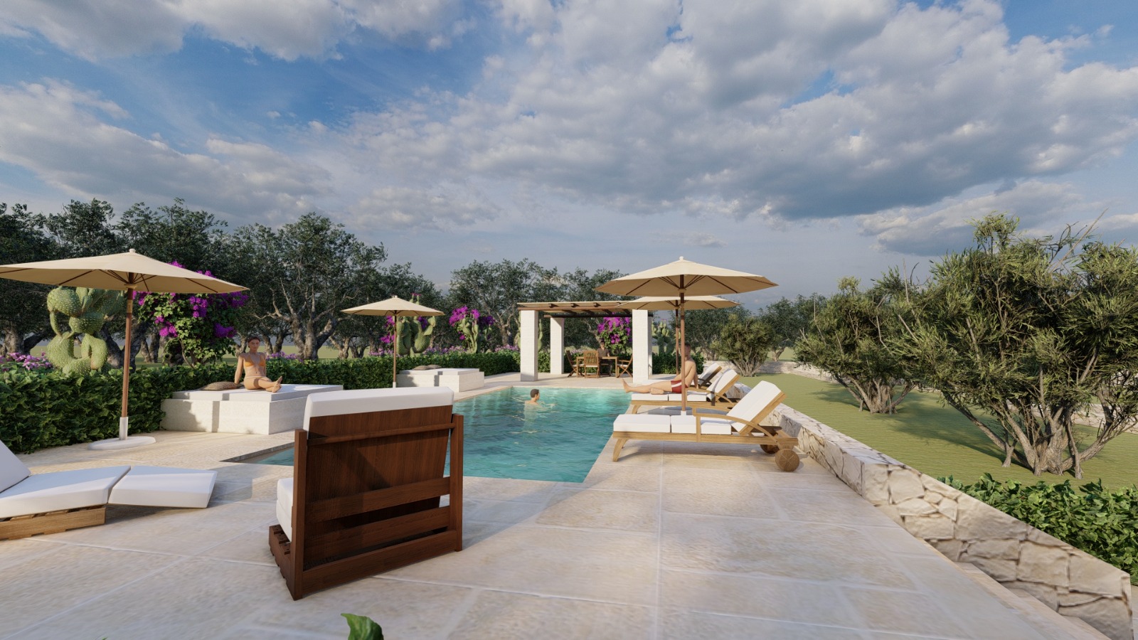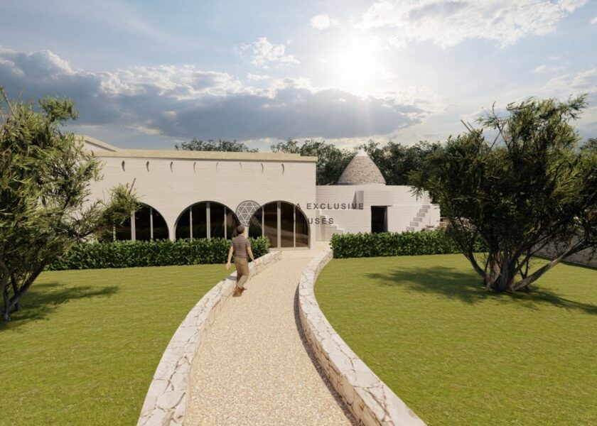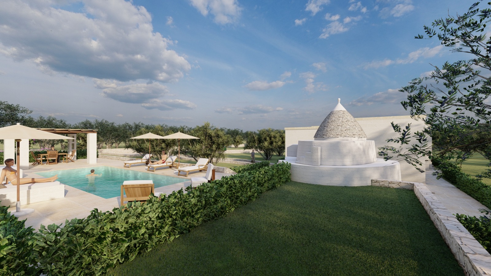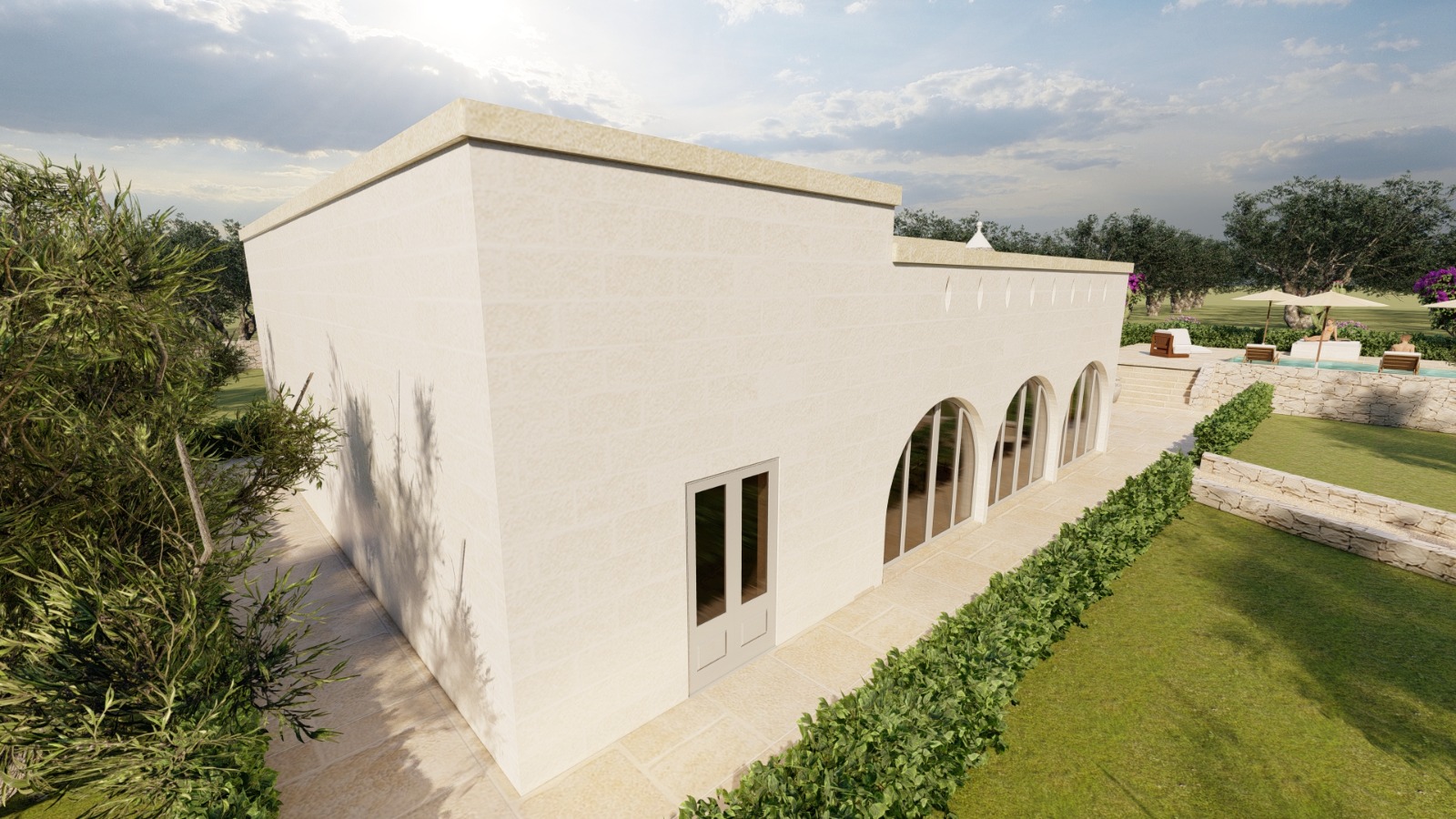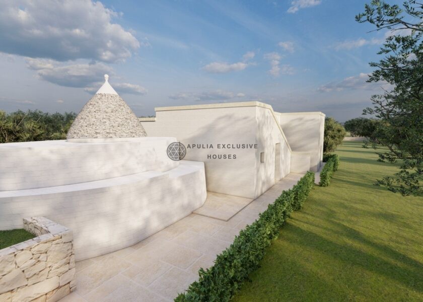 The approved project includes the careful restoration of the original trullo, along with the creation of an elegant and functional extension. Inside the trullo, there is a bedroom with a private bathroom, internally connected to the new building which comprises a spacious living room with an open-plan kitchen, two bedrooms, and two bathrooms.