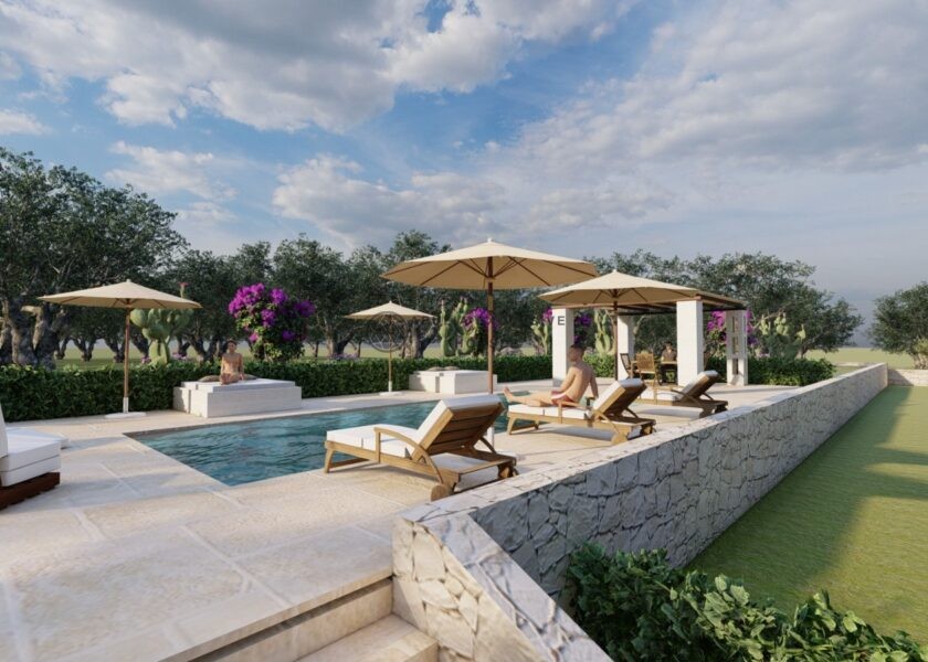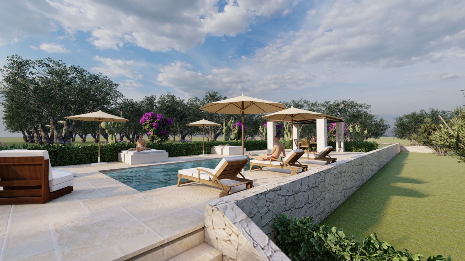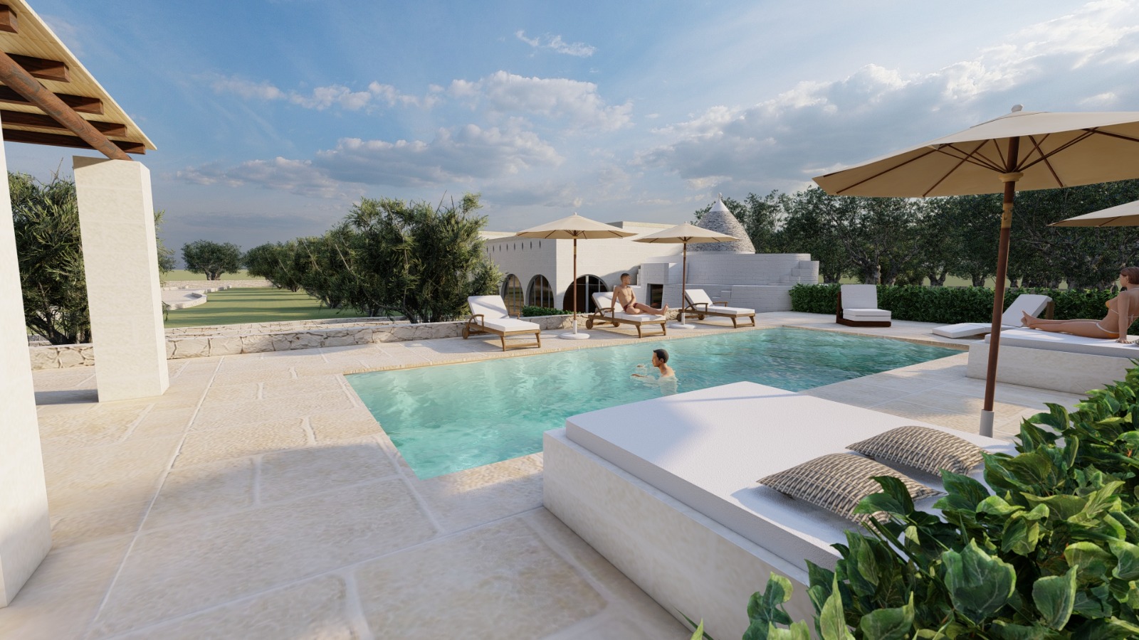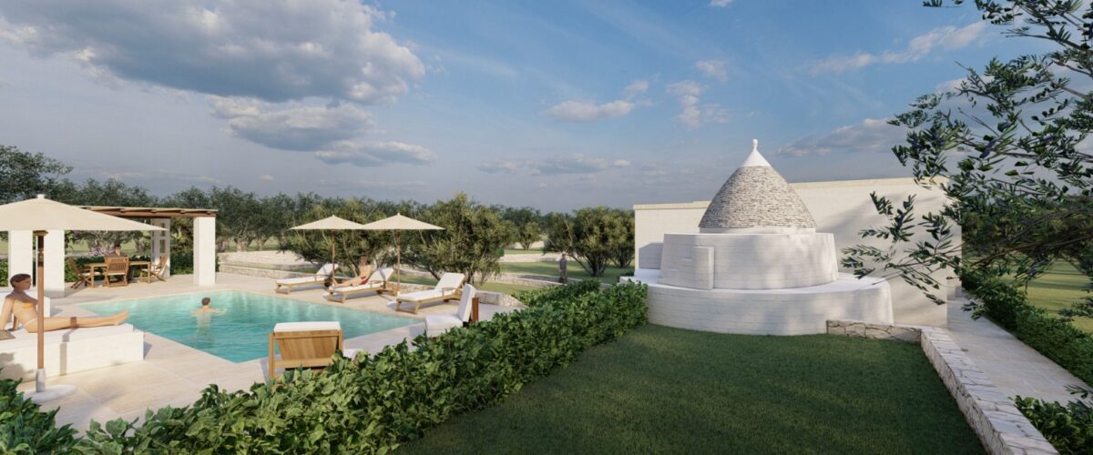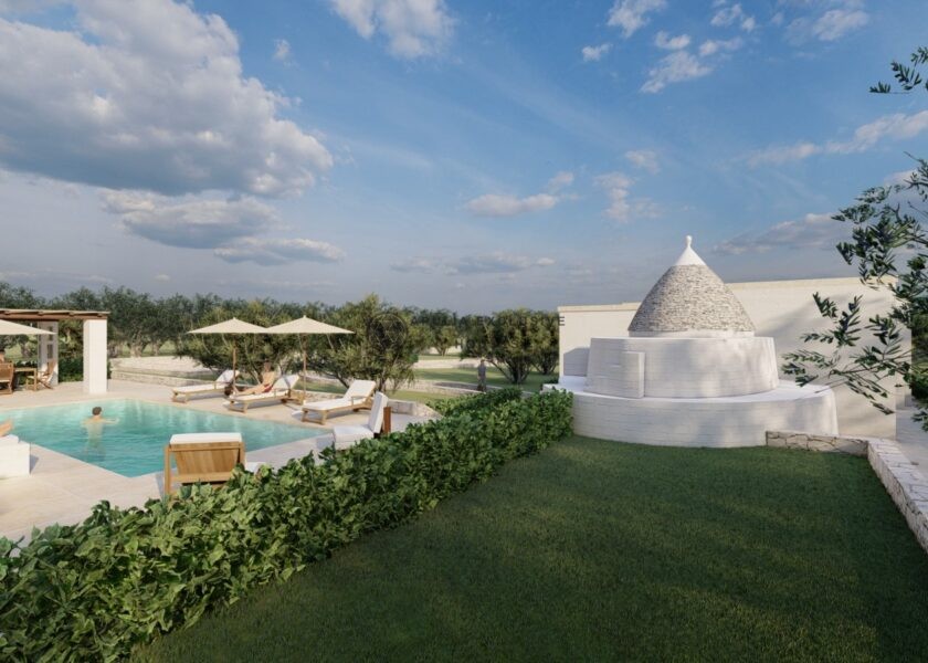 The approved project includes the careful restoration of the original trullo, along with the creation of an elegant and functional extension. Inside the trullo, there is a bedroom with a private bathroom, internally connected to the new building which comprises a spacious living room with an open-plan kitchen, two bedrooms, and two bathrooms.