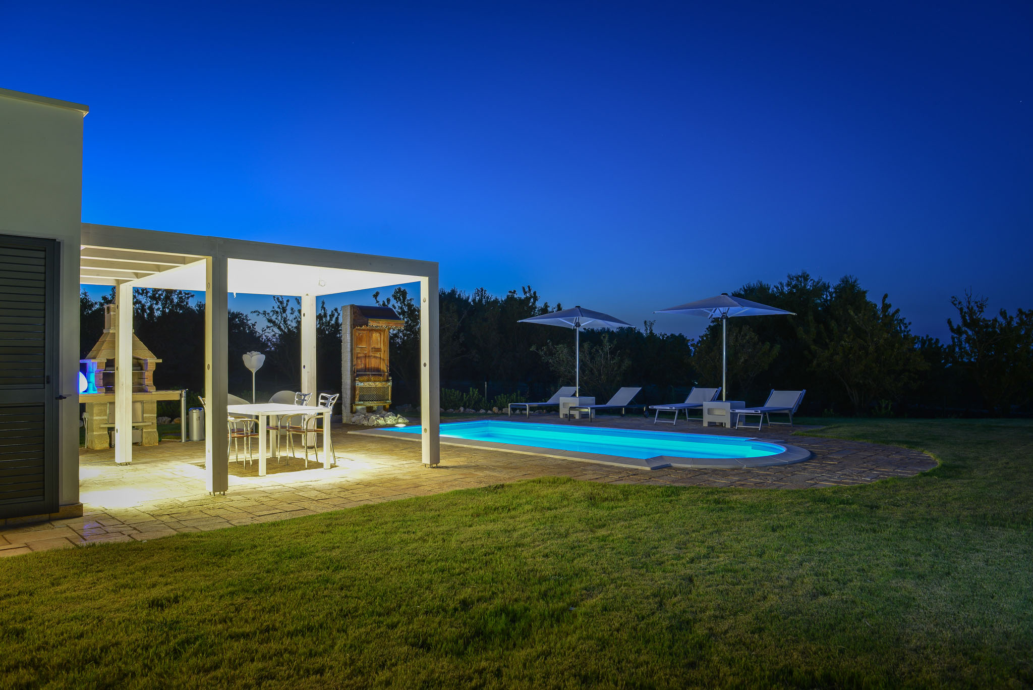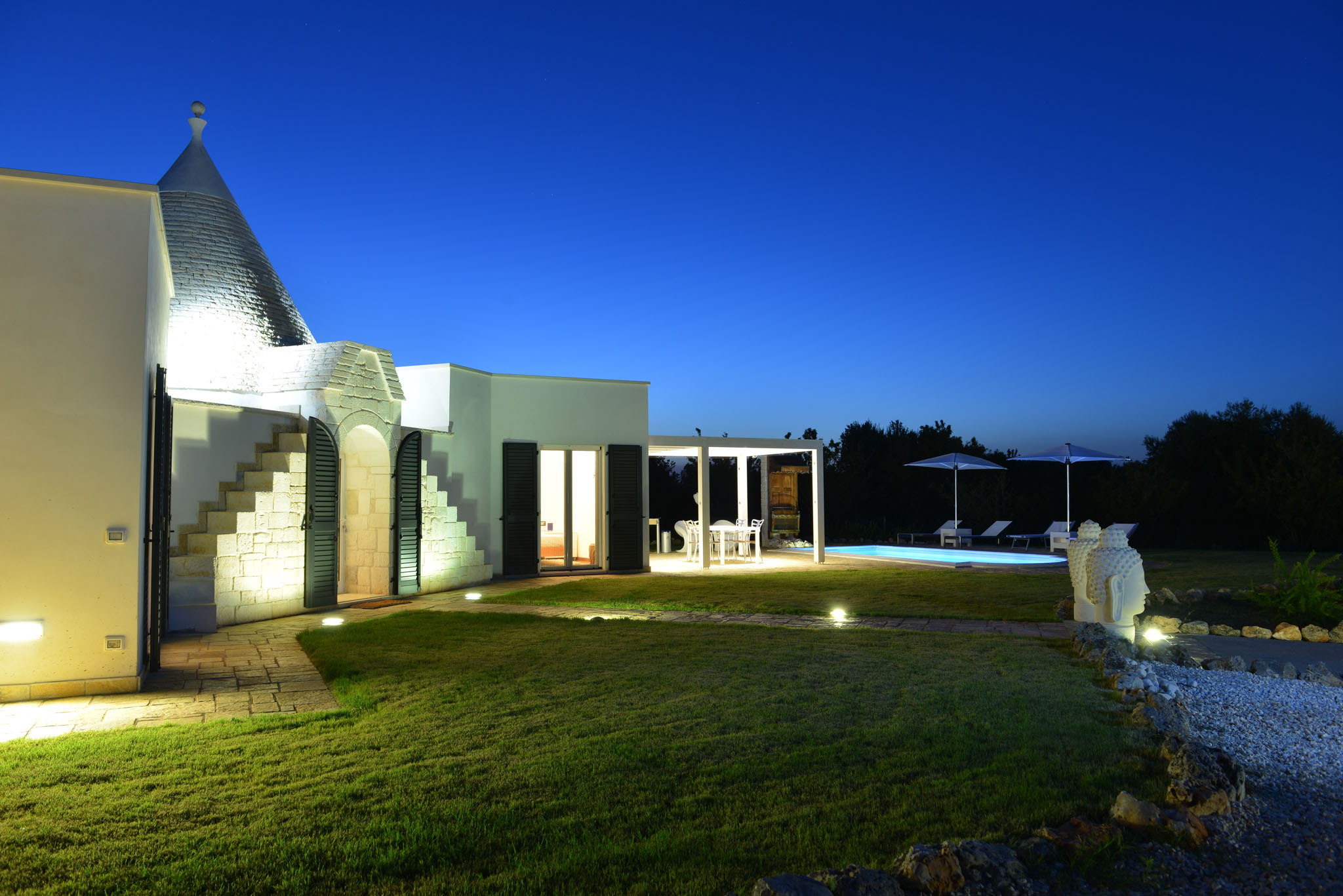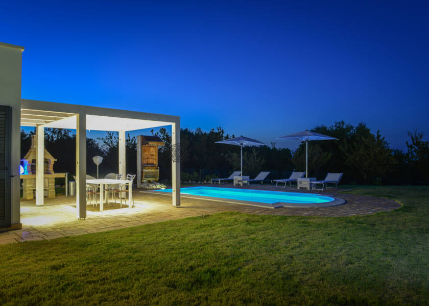 The exteriors are enriched by the refined lawn and by the swimming pool, with a large solarium and an area equipped for outdoor dining, environments made even more evocative at night thanks to the clever lighting system.