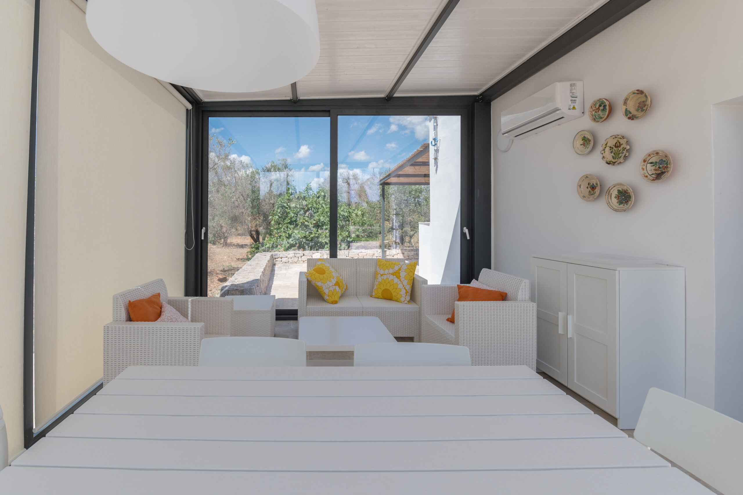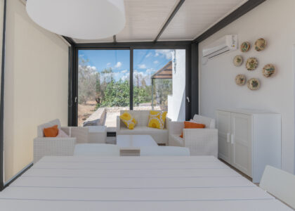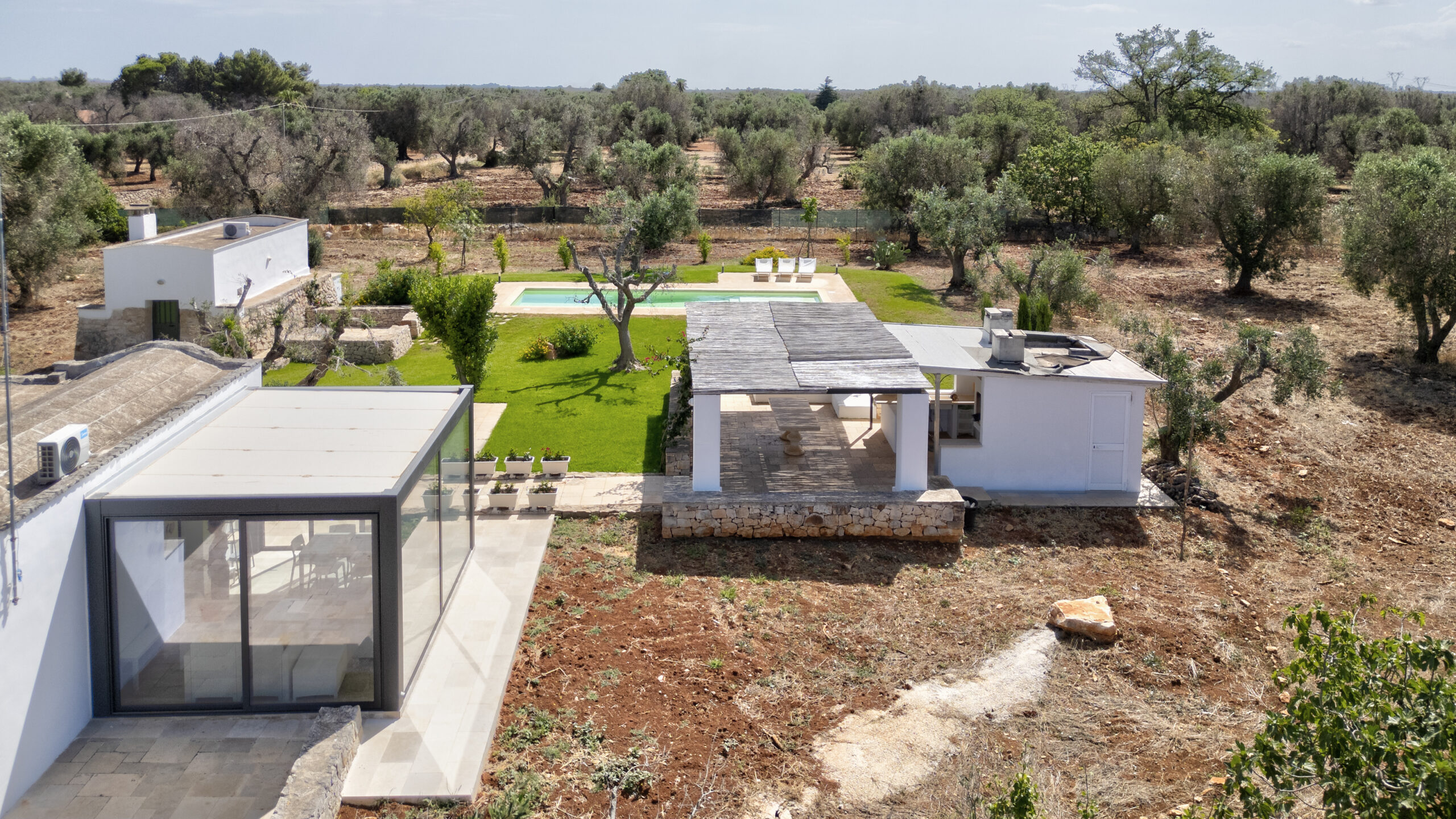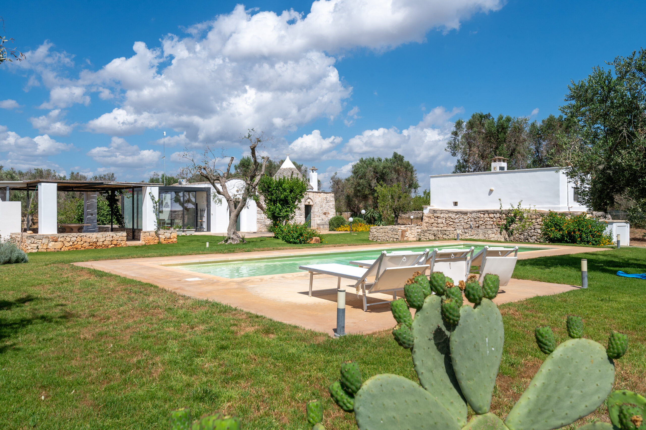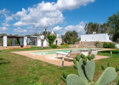 Outside, a 40-metre swimming pool with a maximum depth of 1.50 metres, barbecue area and wood-burning oven, and a comfortable brick-built table, are immersed in a well-kept garden that allows guests to enjoy the wide views and breathtaking sunsets that the Apulian countryside offers.