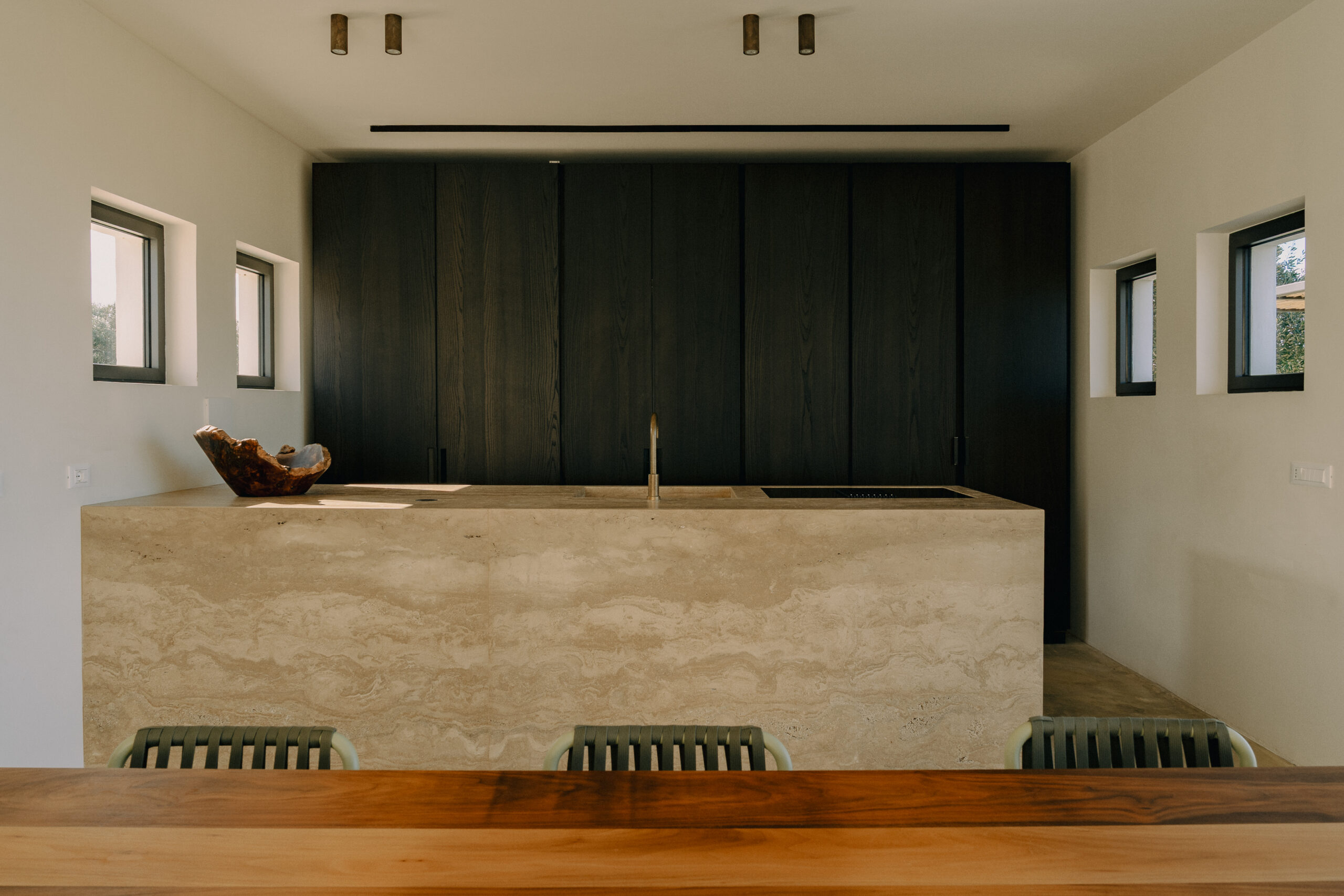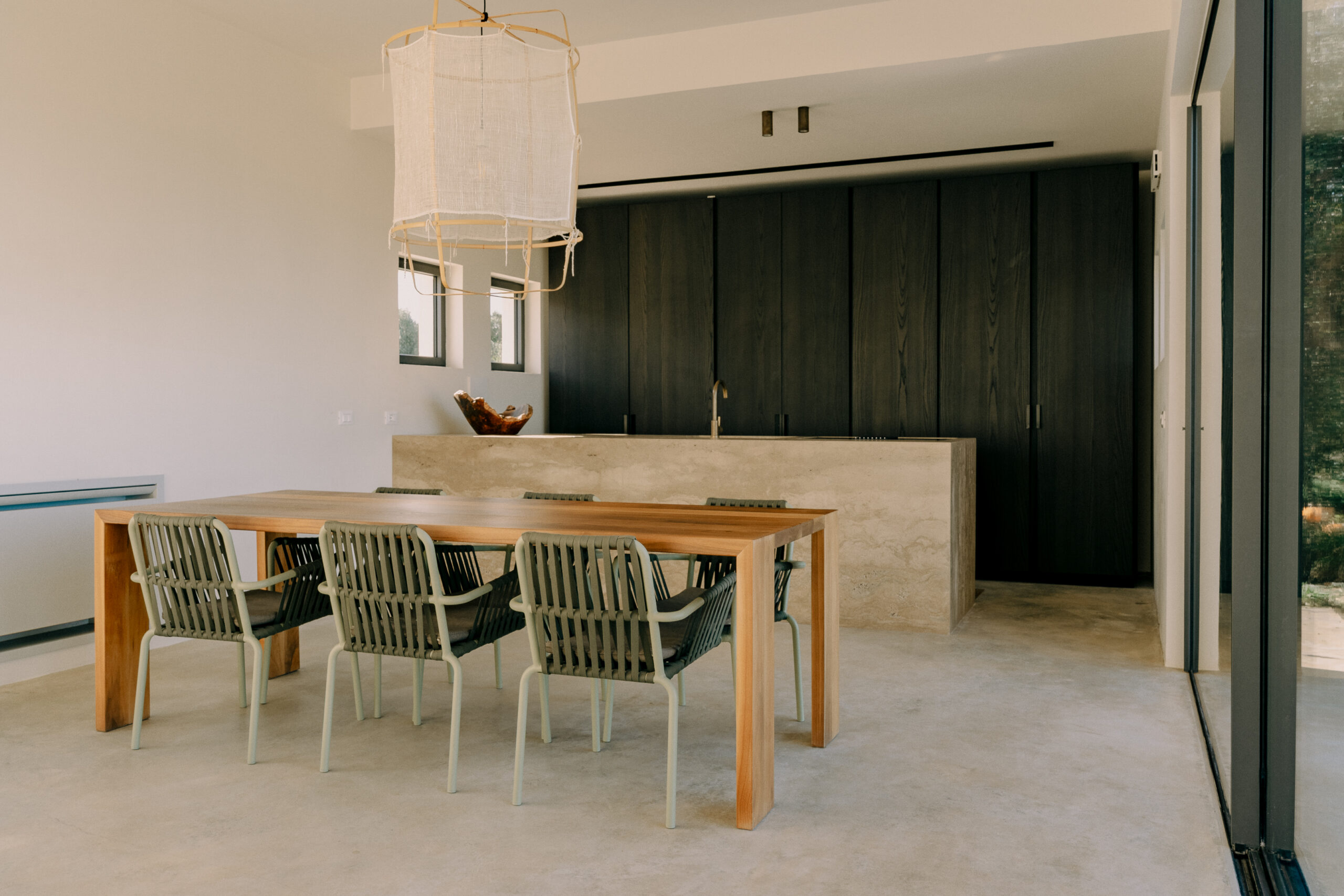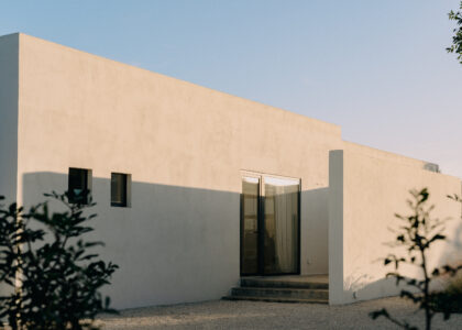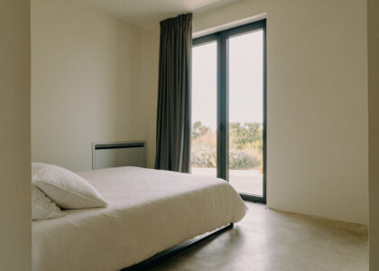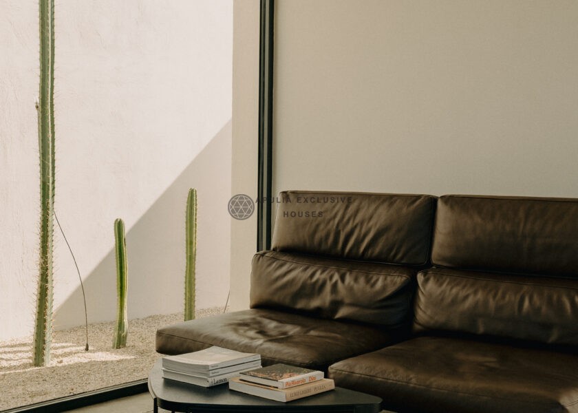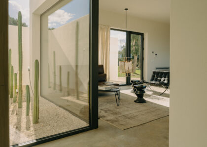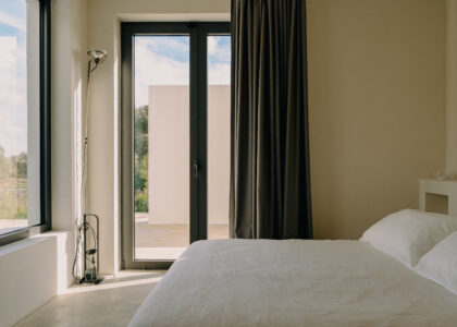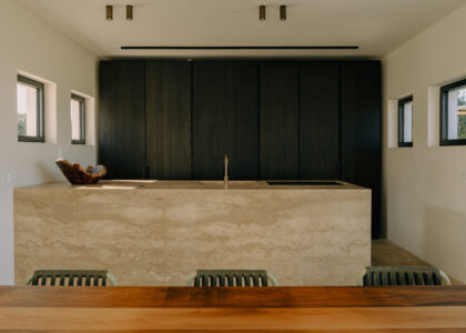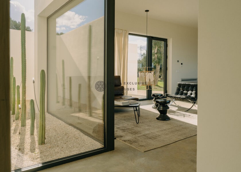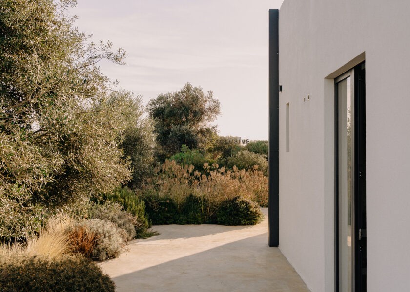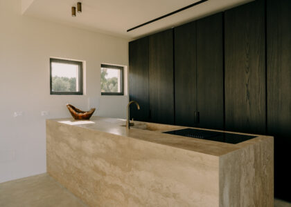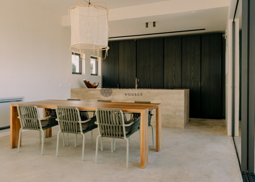 All natural materials make up the exquisite home. Large windows open onto the pool terrace and the beautiful eat-in kitchen features a unique combination of local marble and rich dark wood. Abundant nature surrounds this geometric villa, whose angular structure is softened by luxurious flower beds, scattered shrubs and gently twisting olive trees. The sophisticated, dark-colored infinity pool is the focal point of the outdoor areas.