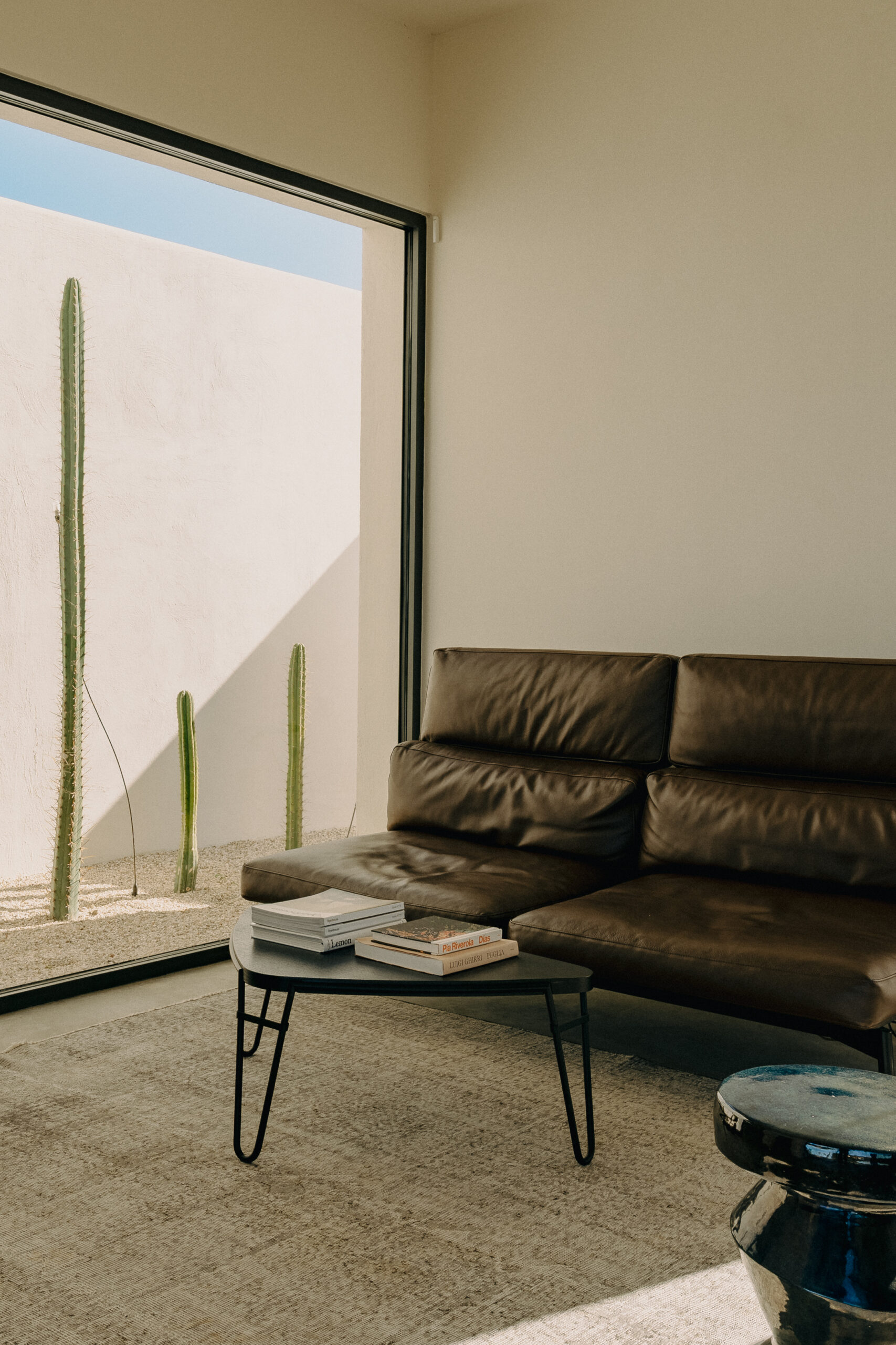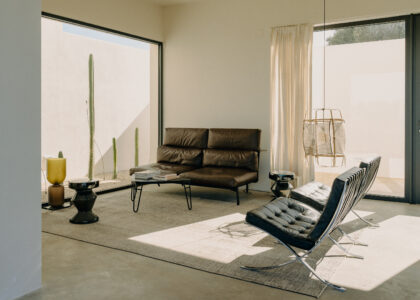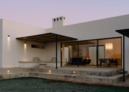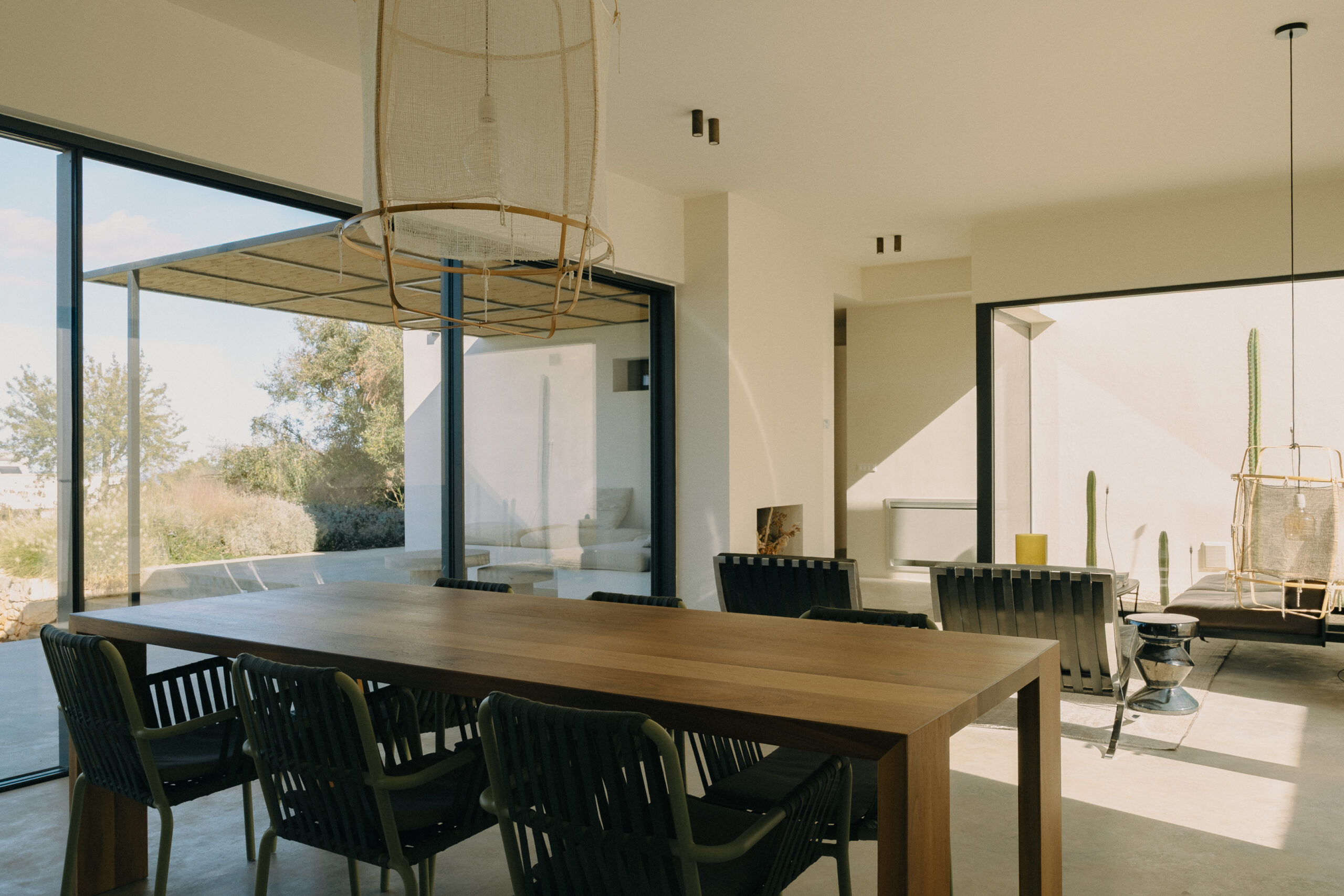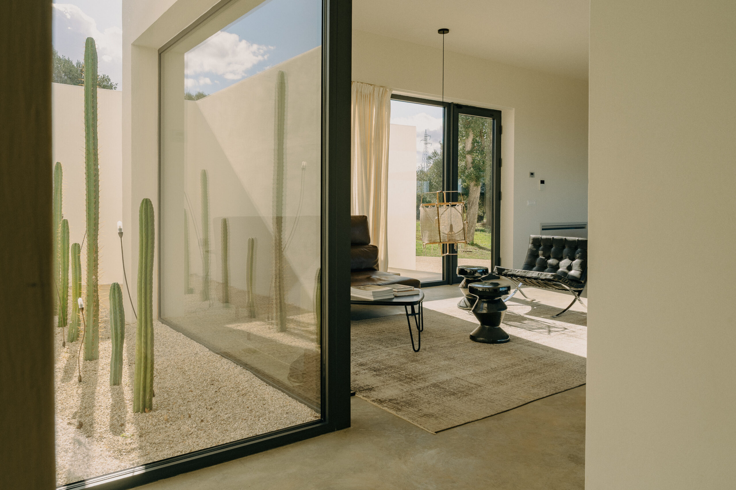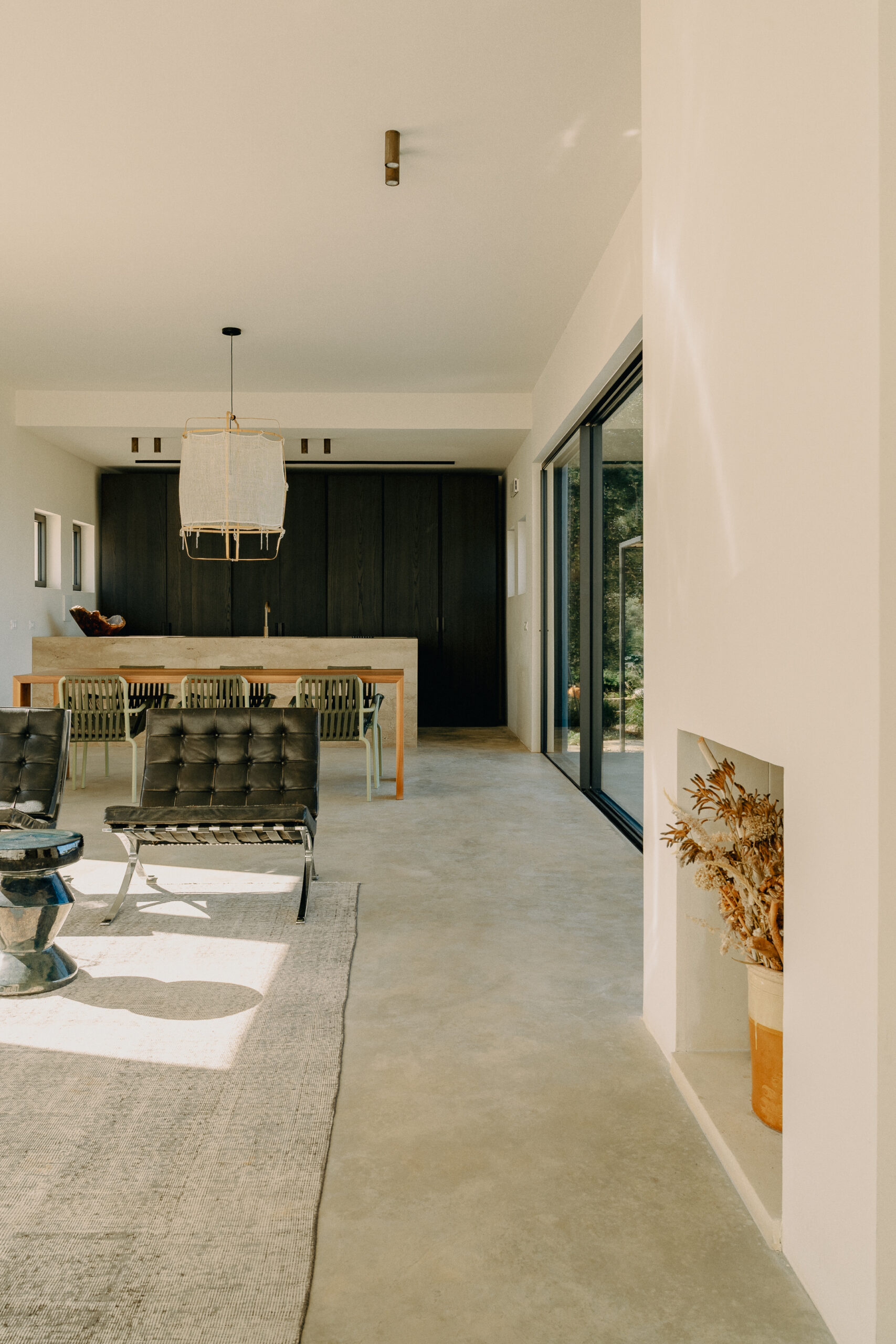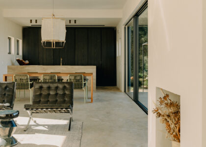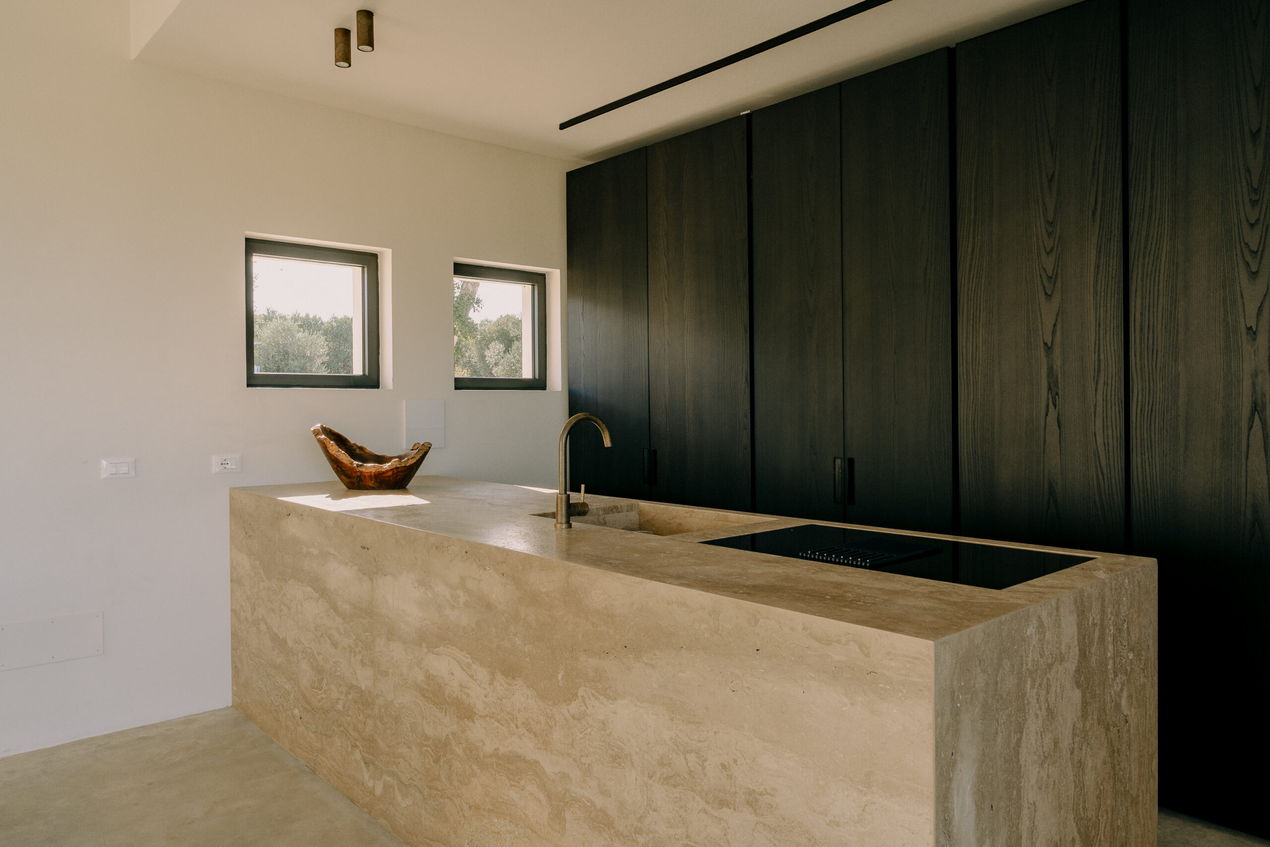 All natural materials make up the exquisite home. Large windows open onto the pool terrace and the beautiful eat-in kitchen features a unique combination of local marble and rich dark wood. Abundant nature surrounds this geometric villa, whose angular structure is softened by luxurious flower beds, scattered shrubs and gently twisting olive trees. The sophisticated, dark-colored infinity pool is the focal point of the outdoor areas.