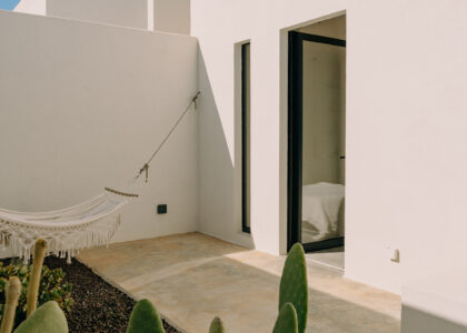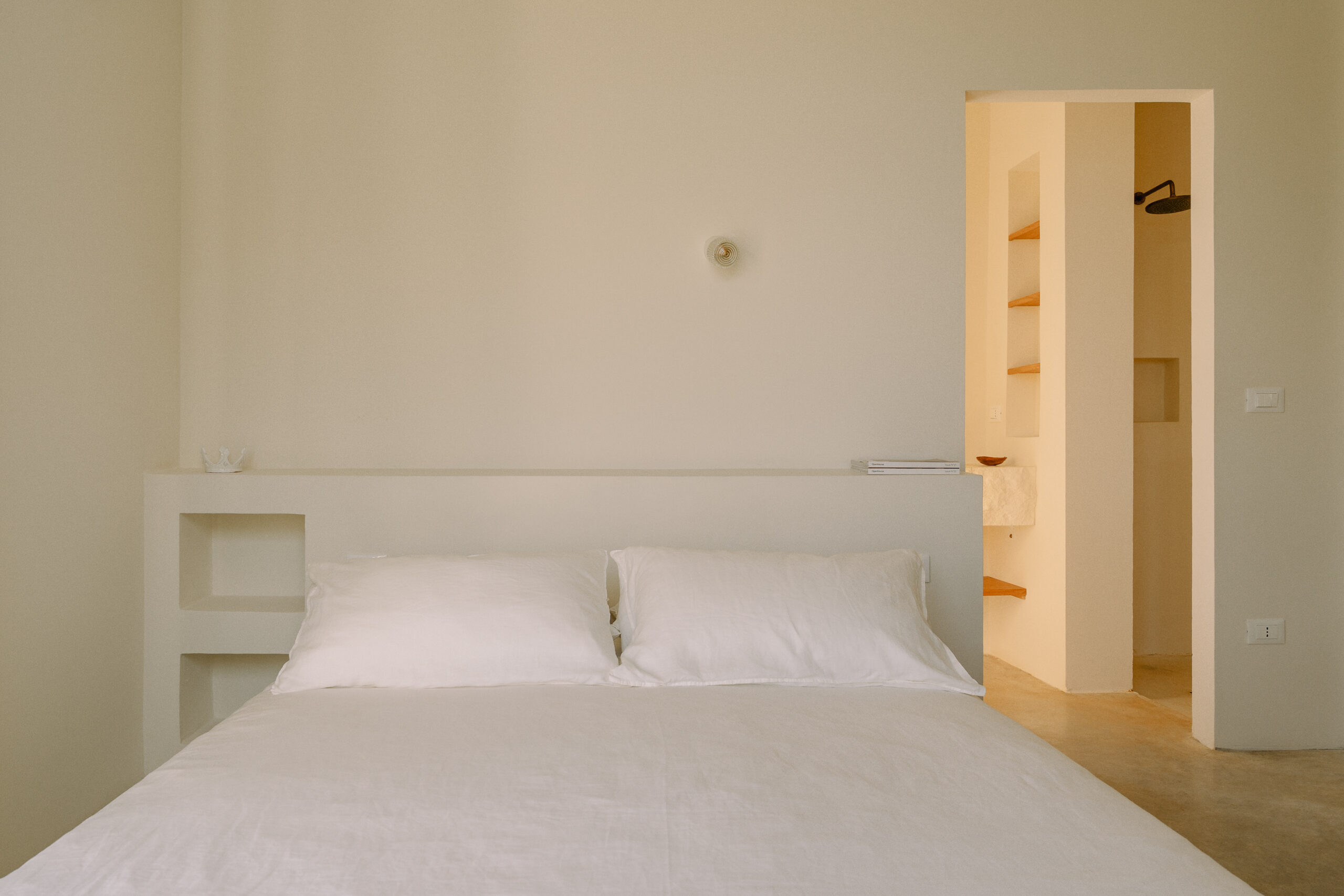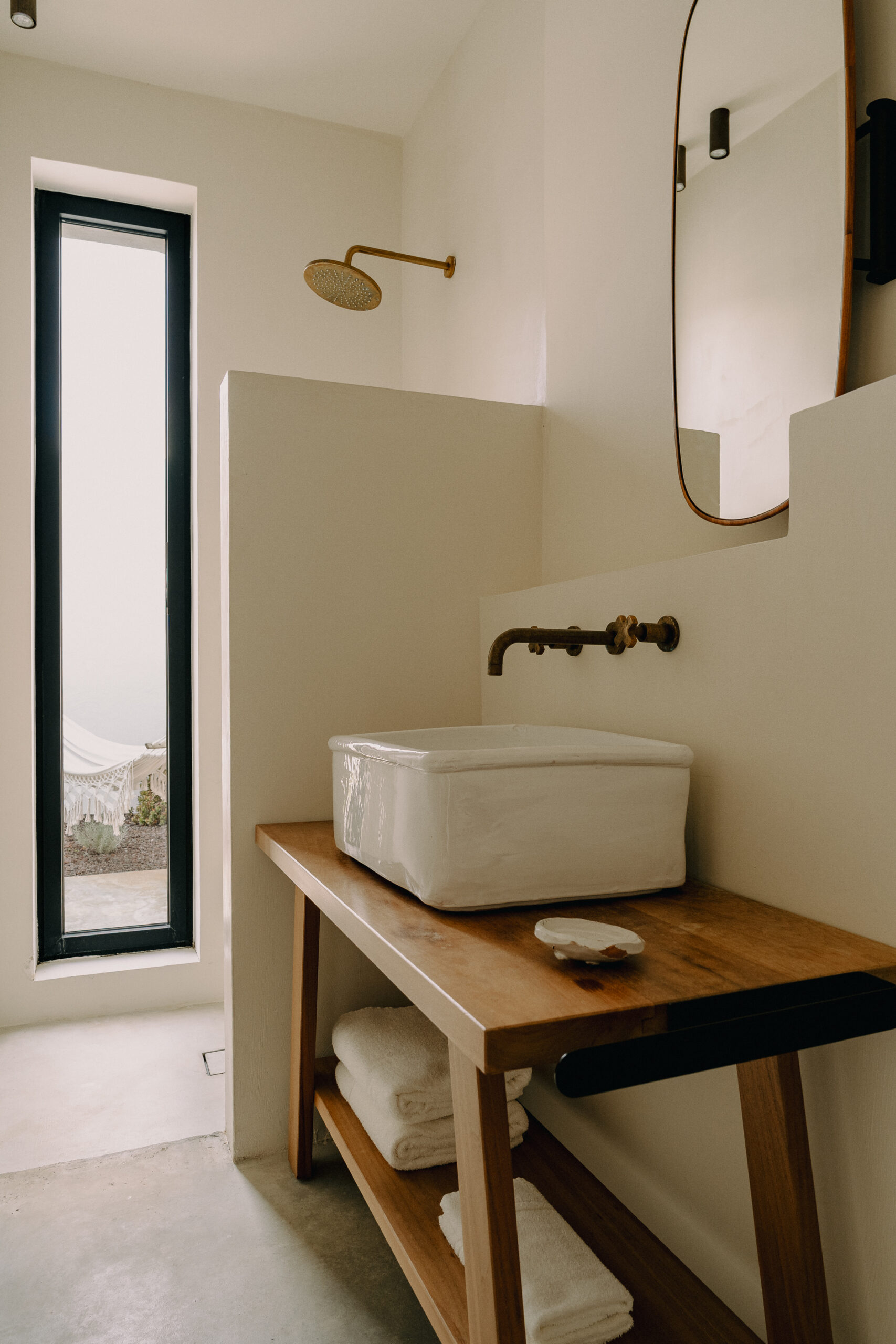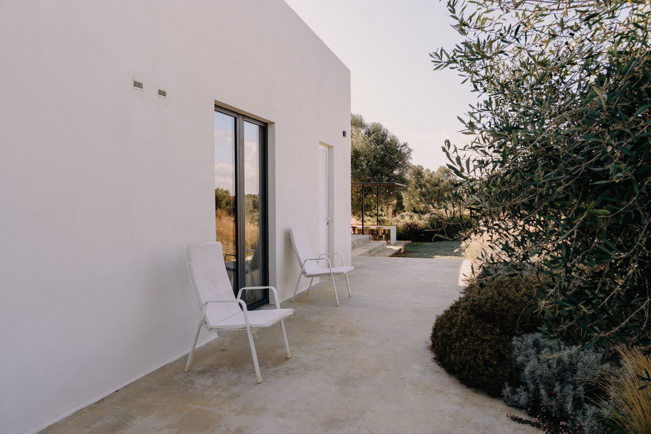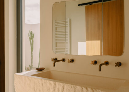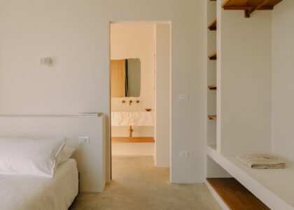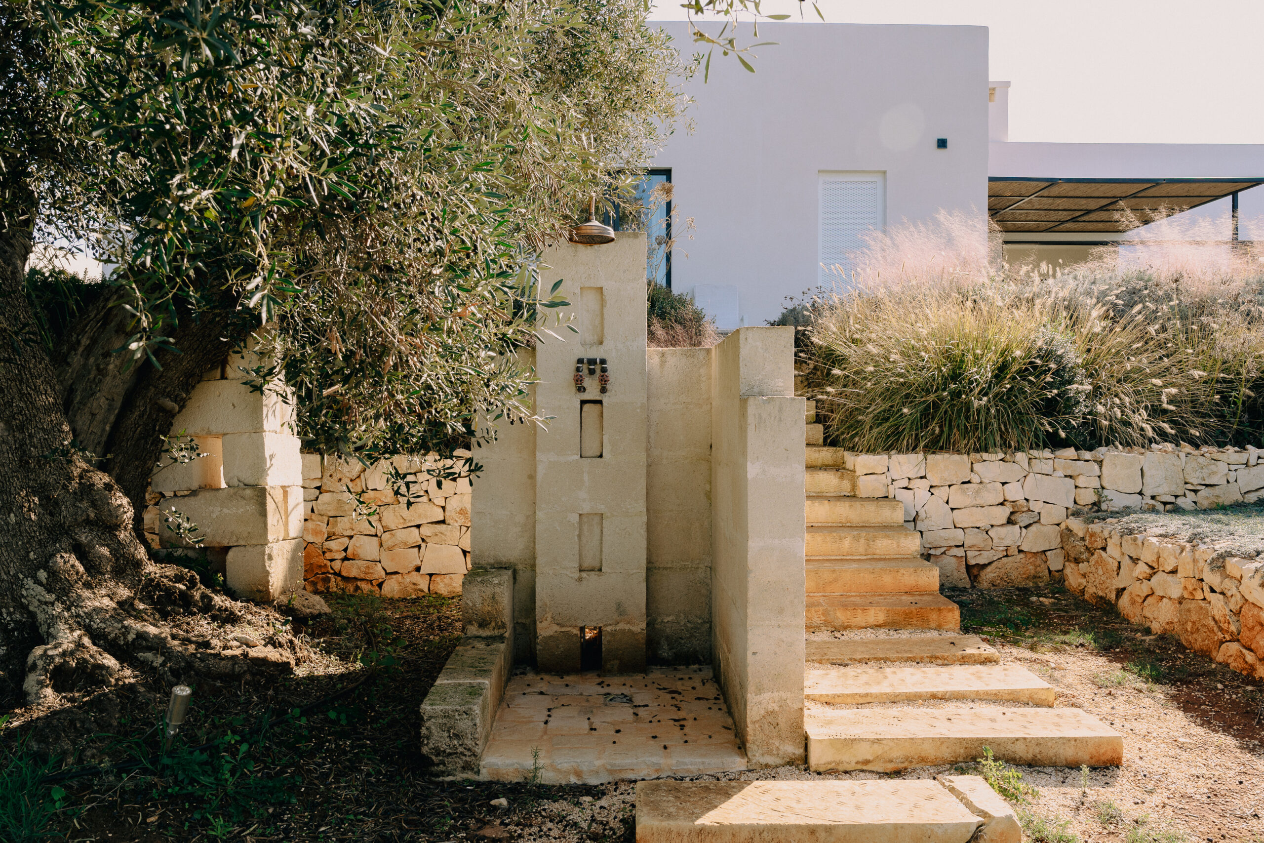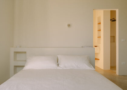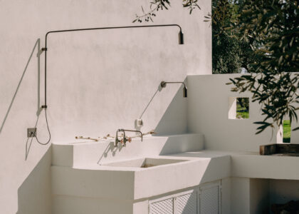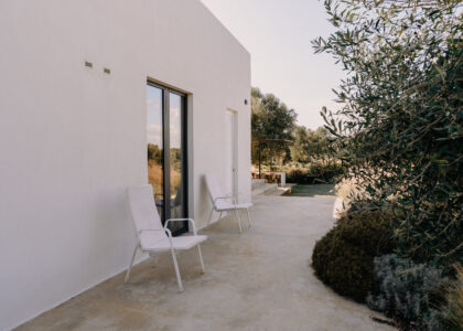 Three double bedrooms, each with a private bathroom and an outdoor courtyard with showers. An additional bathroom offers more privacy and comfort for all guests. All suites are simply but elegantly furnished and overlook the garden and grove with a glimpse of the sea view.