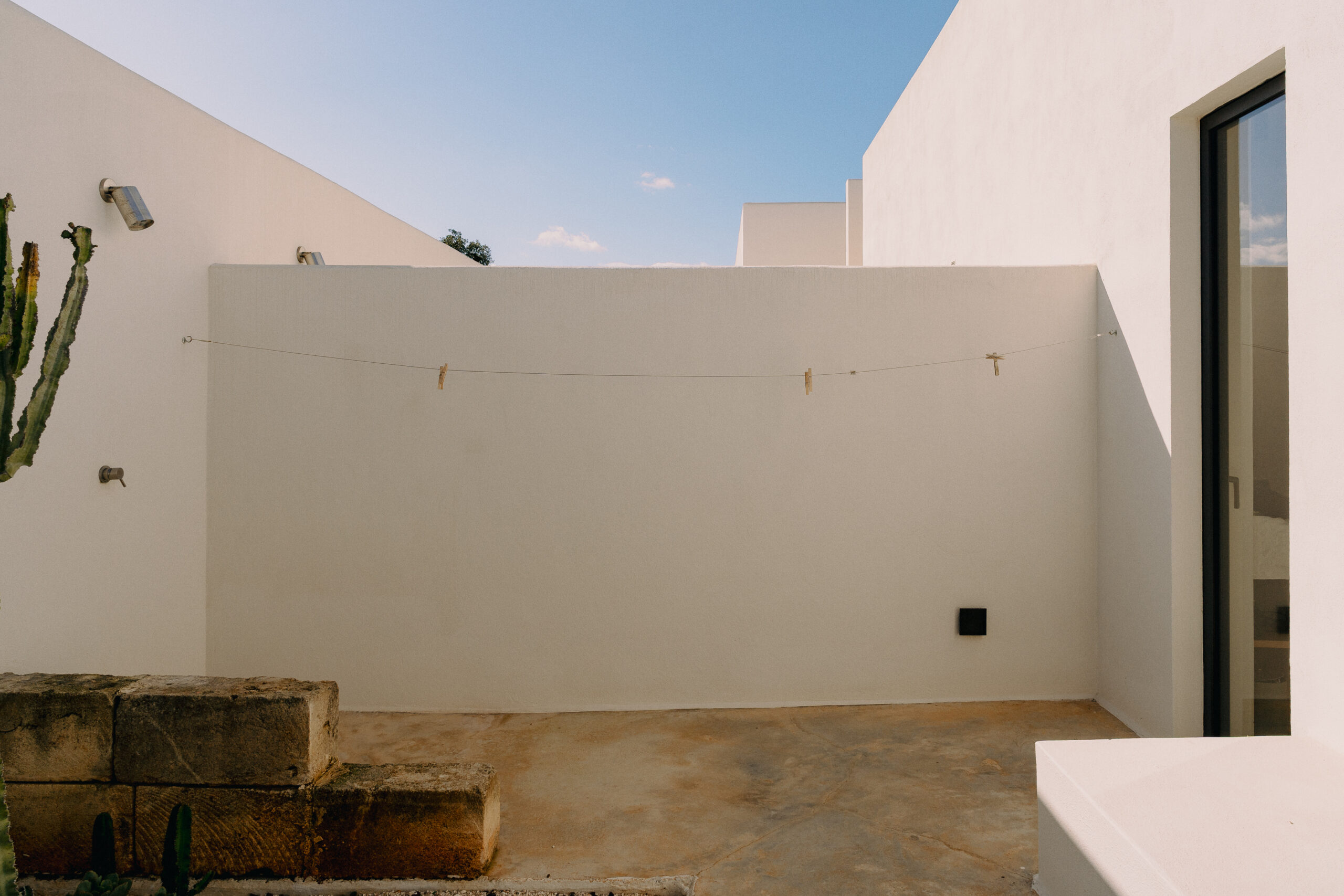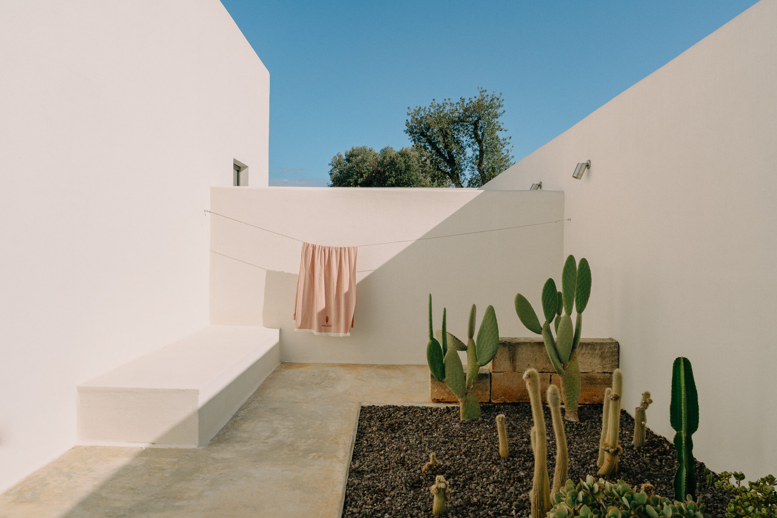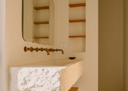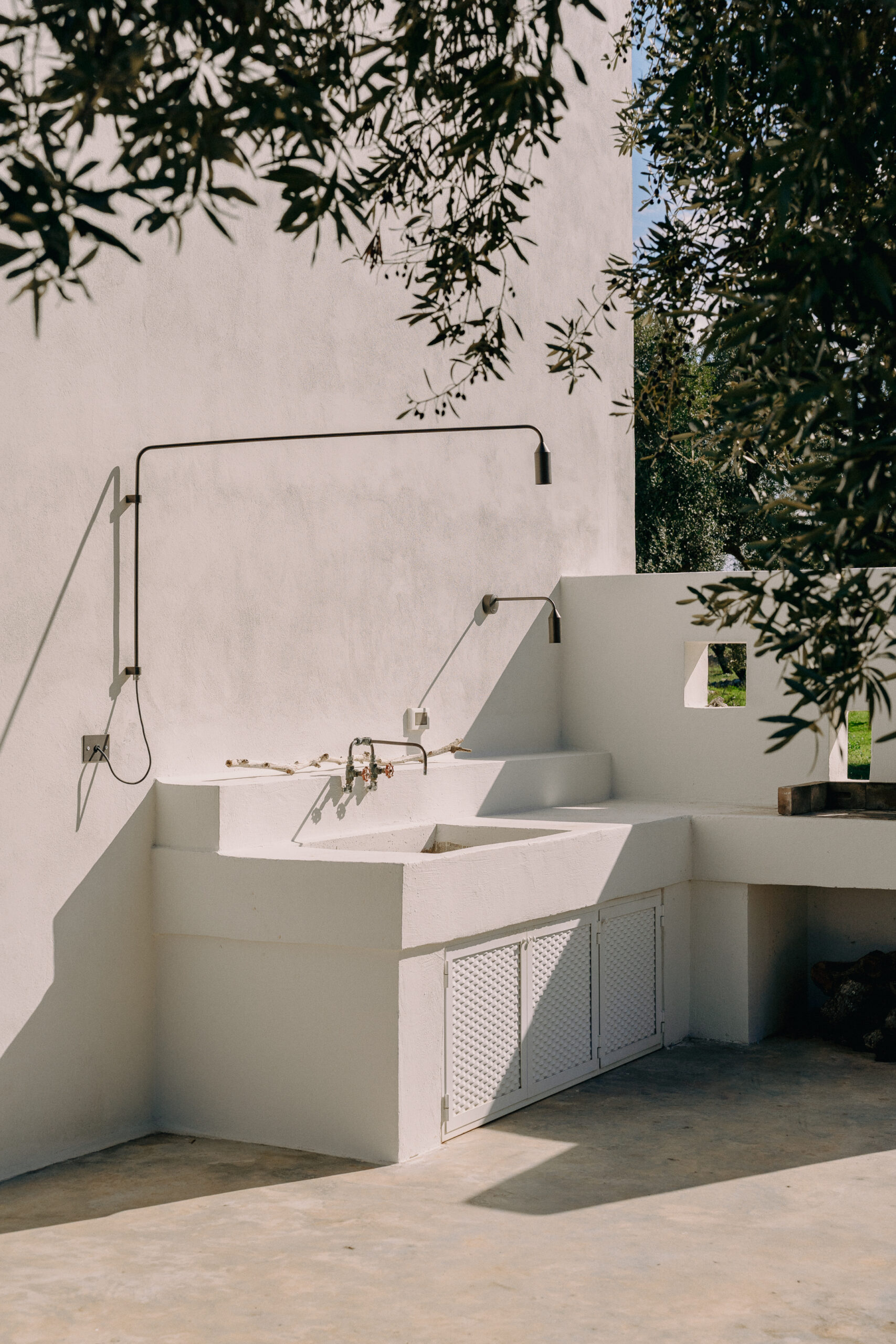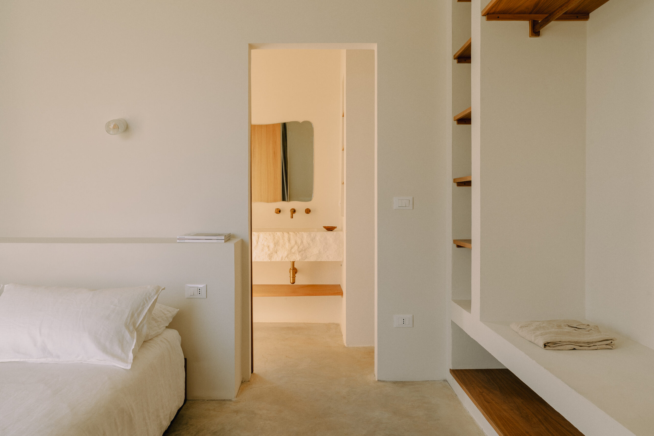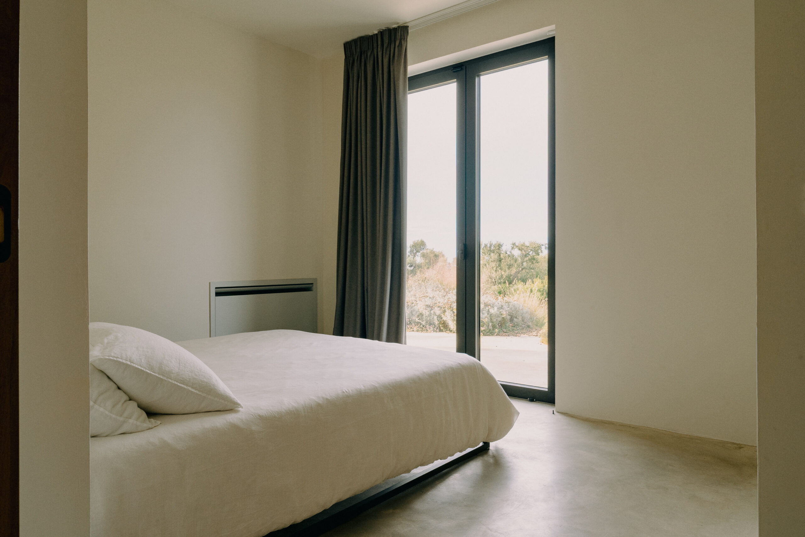 Three double bedrooms, each with a private bathroom and an outdoor courtyard with showers. An additional bathroom offers more privacy and comfort for all guests. All suites are simply but elegantly furnished and overlook the garden and grove with a glimpse of the sea view.