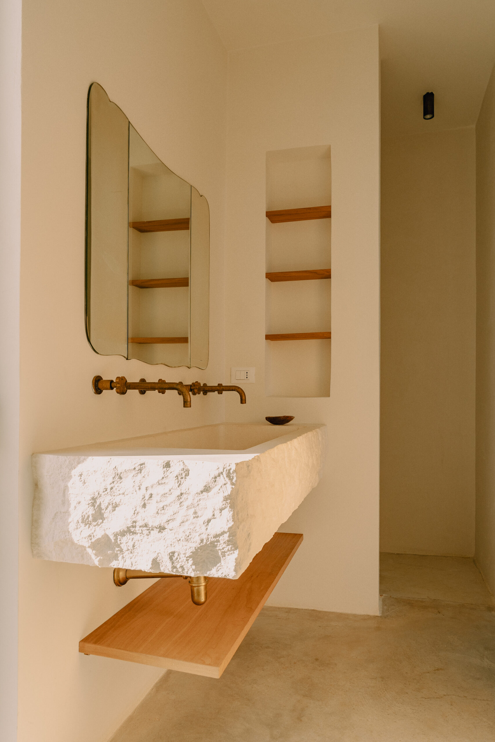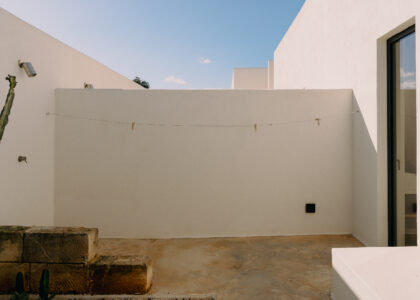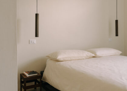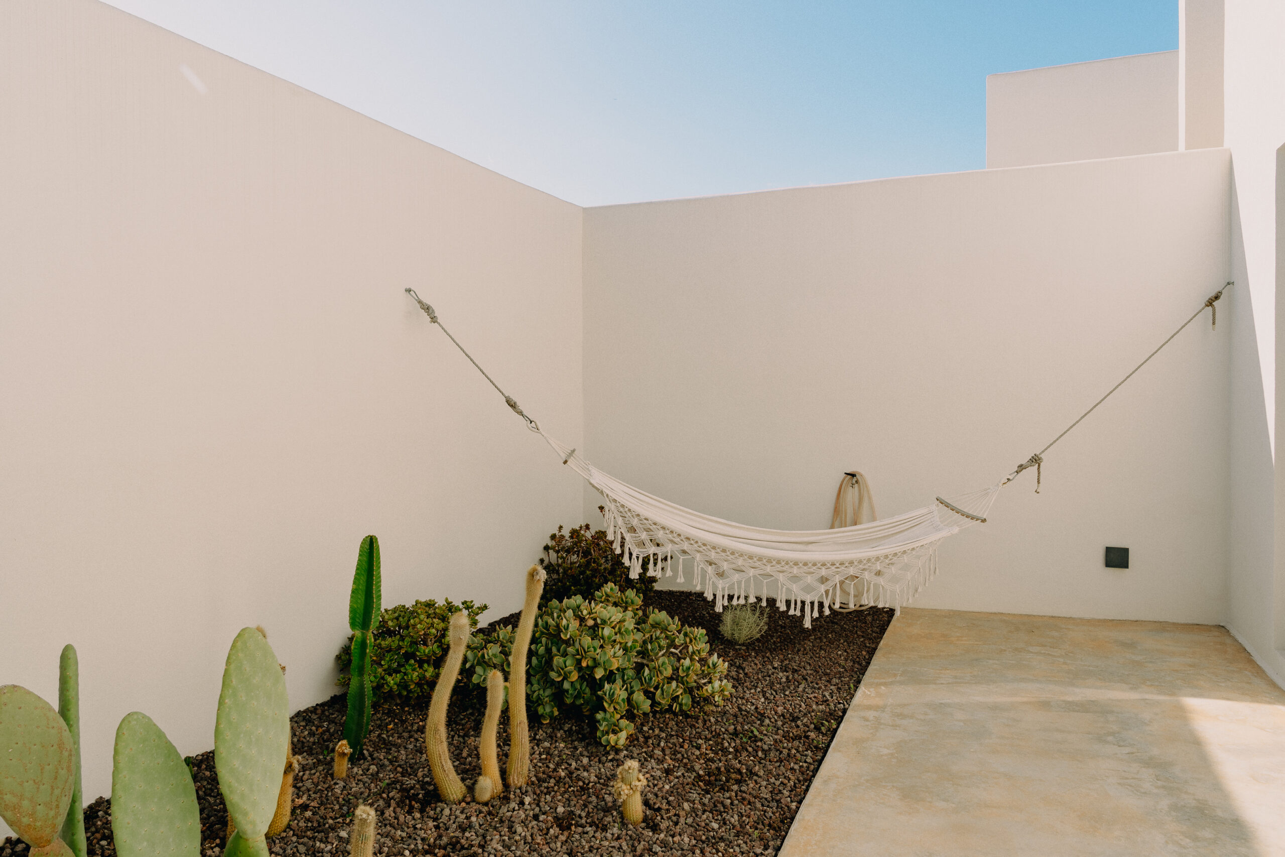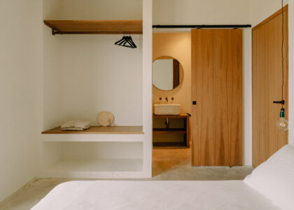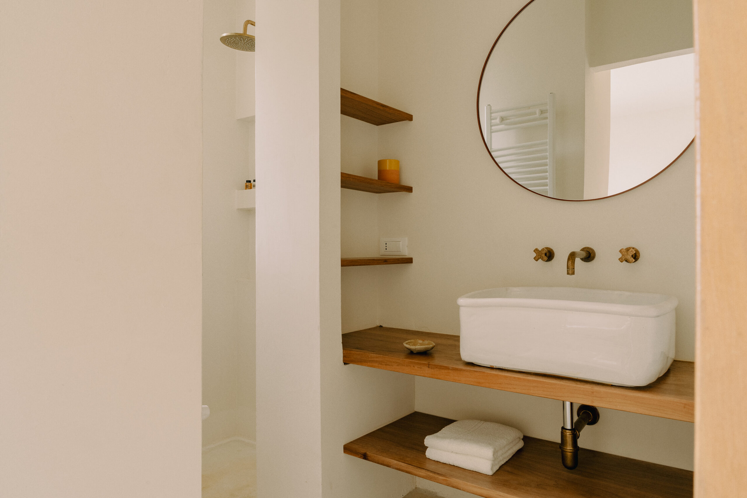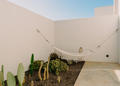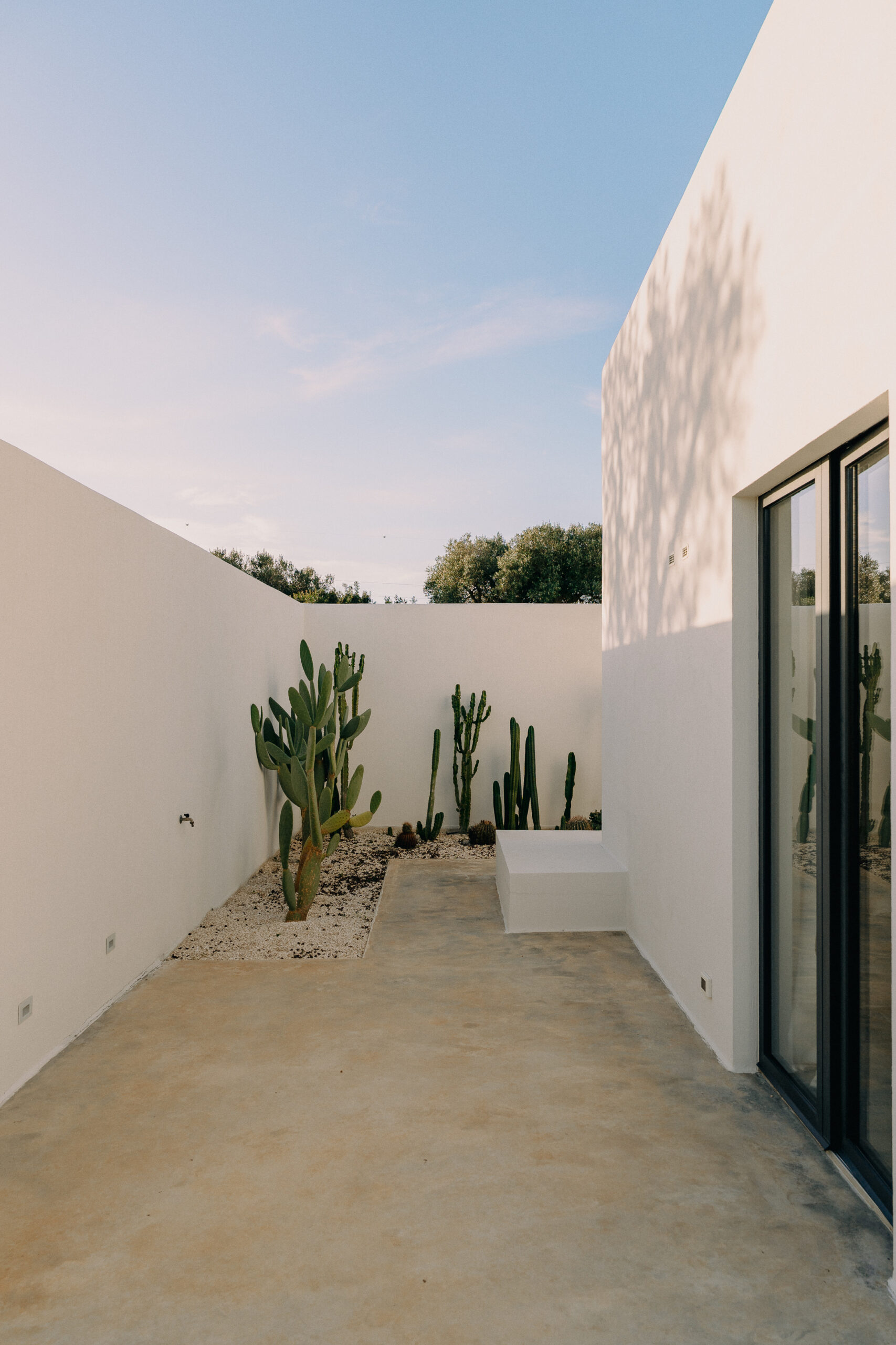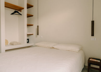 Three double bedrooms, each with a private bathroom and an outdoor courtyard with showers. An additional bathroom offers more privacy and comfort for all guests. All suites are simply but elegantly furnished and overlook the garden and grove with a glimpse of the sea view.