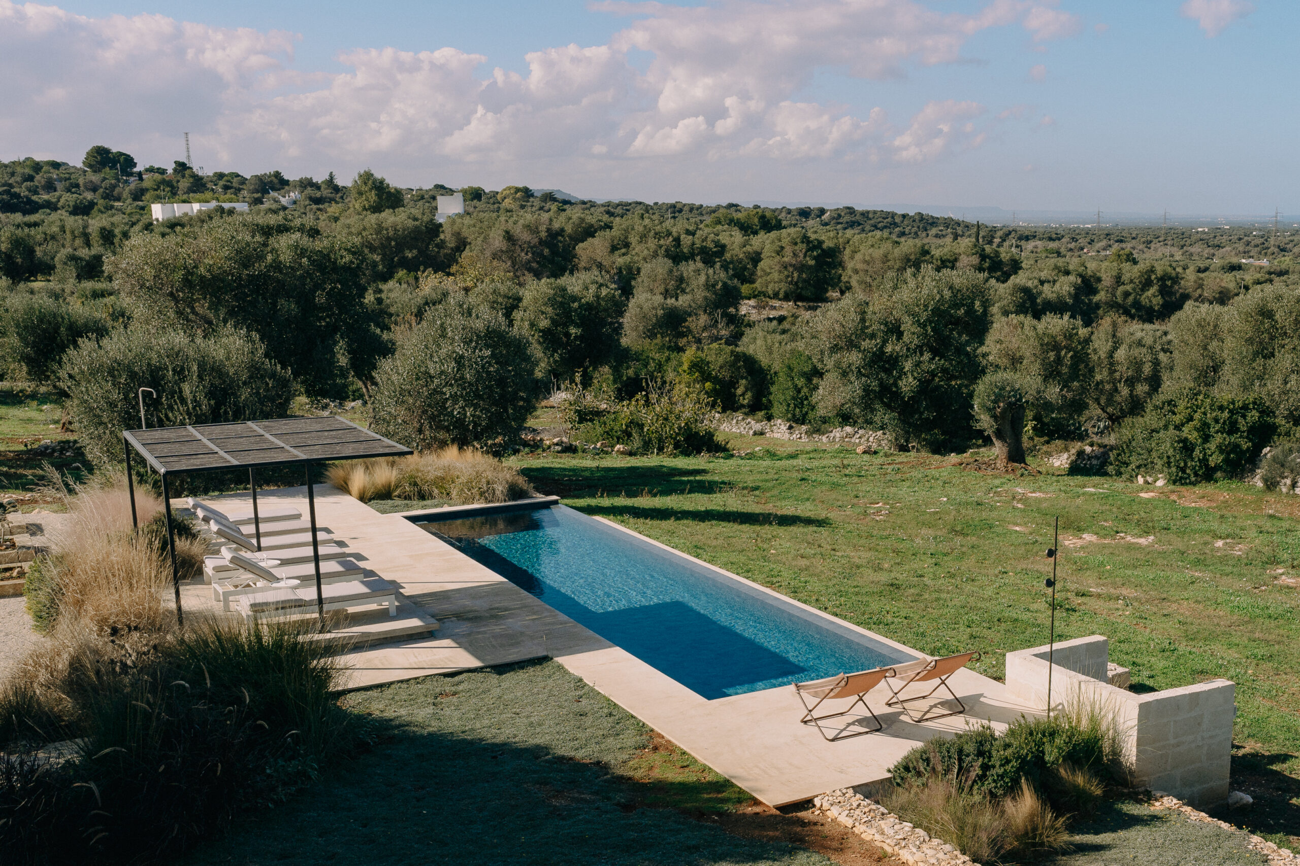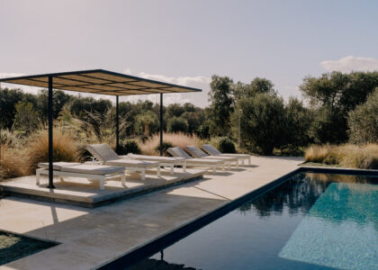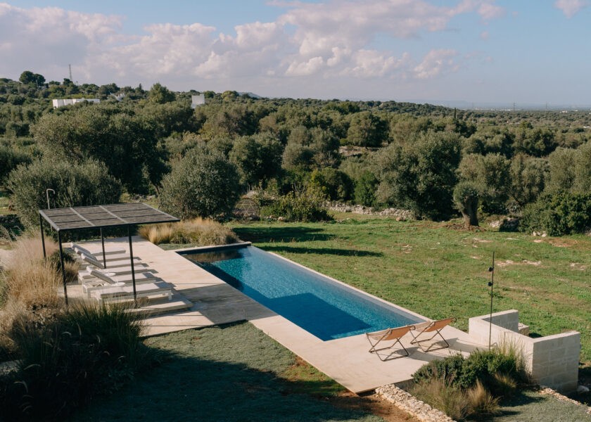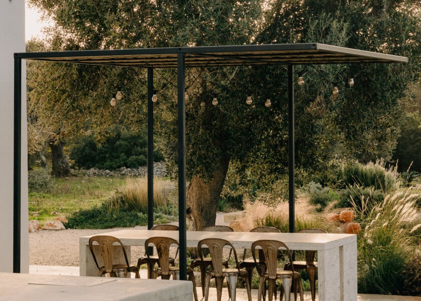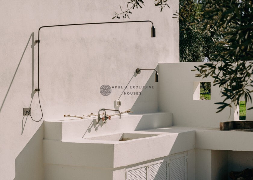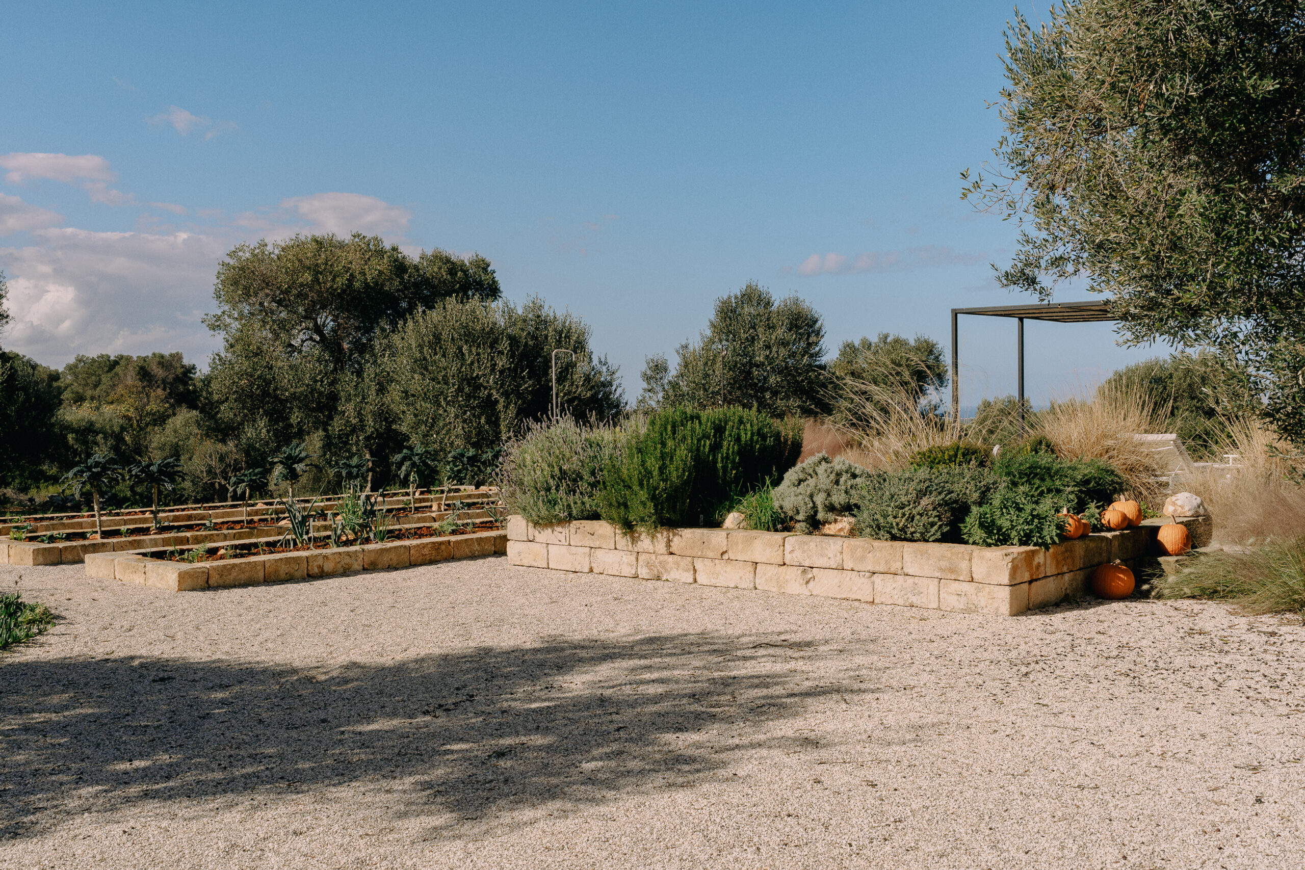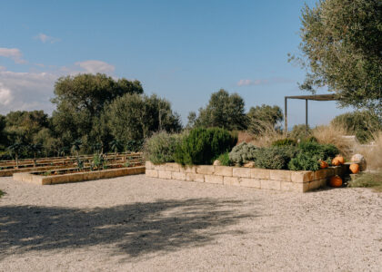 The kitchen opens onto an outdoor dining area with a barbecue and a natural marble table set in a shaded pergola adjacent to the pool. Directly connected to the outdoor kitchen is an organic vegetable garden that offers guests all the purity and freshness of local produce.