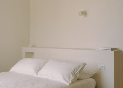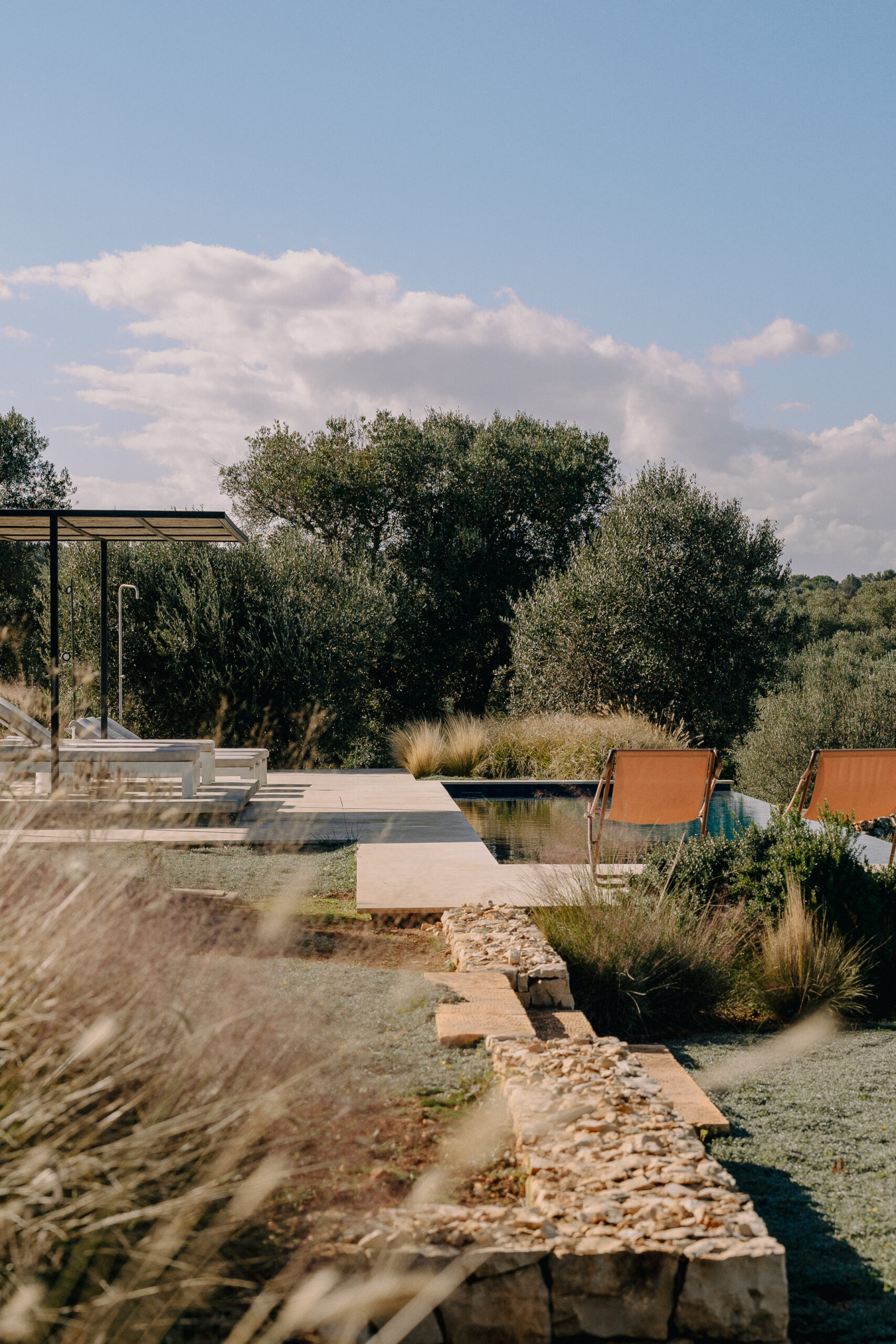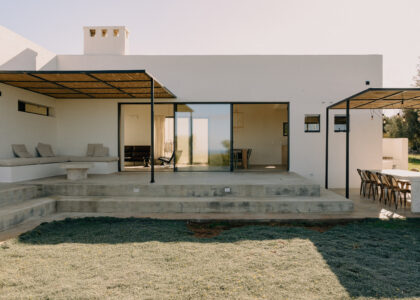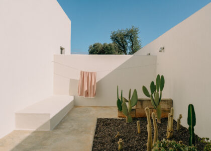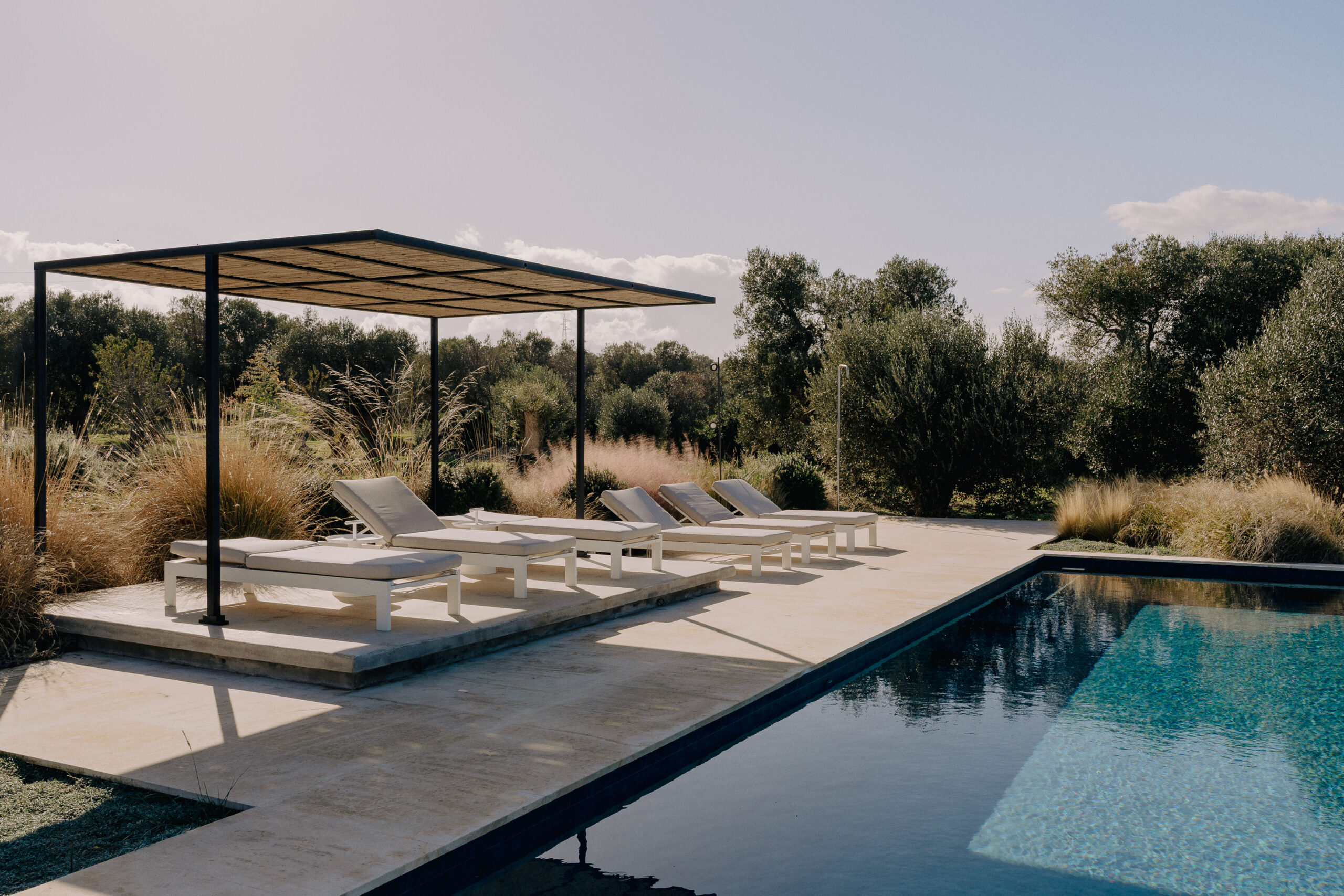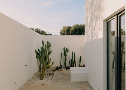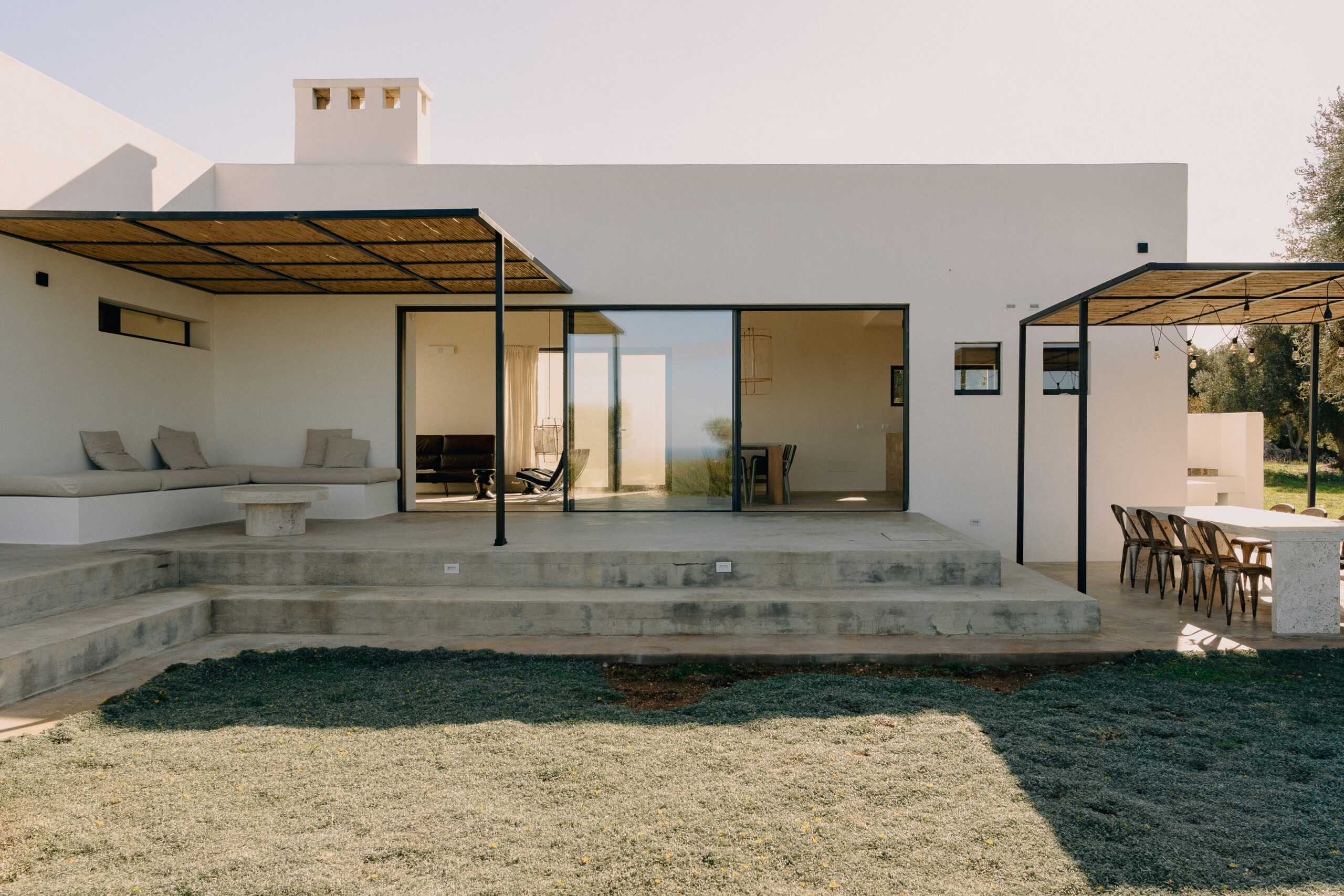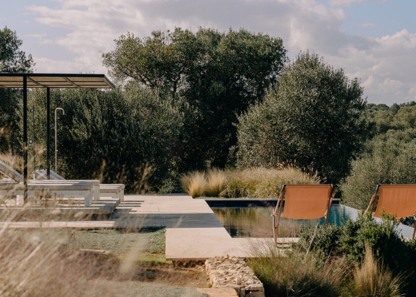 The kitchen opens onto an outdoor dining area with a barbecue and a natural marble table set in a shaded pergola adjacent to the pool. Directly connected to the outdoor kitchen is an organic vegetable garden that offers guests all the purity and freshness of local produce.