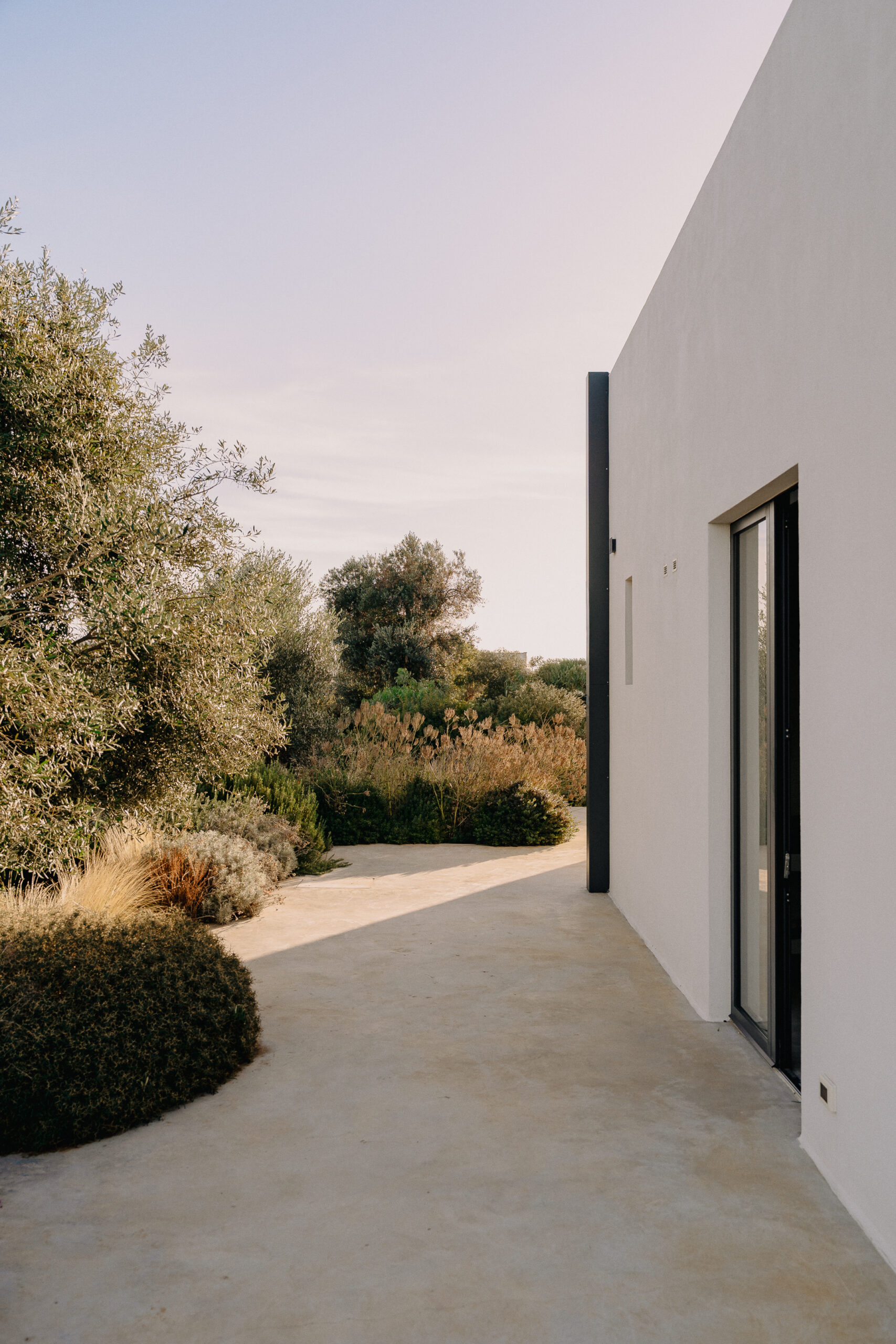 The exterior is private and peaceful. The villa is fenced off and artfully set among the surrounding olive trees. Illuminated pathways venture into the garden space and the swimming pool offers a view of the landscaped flowerbeds, lawn and sea.