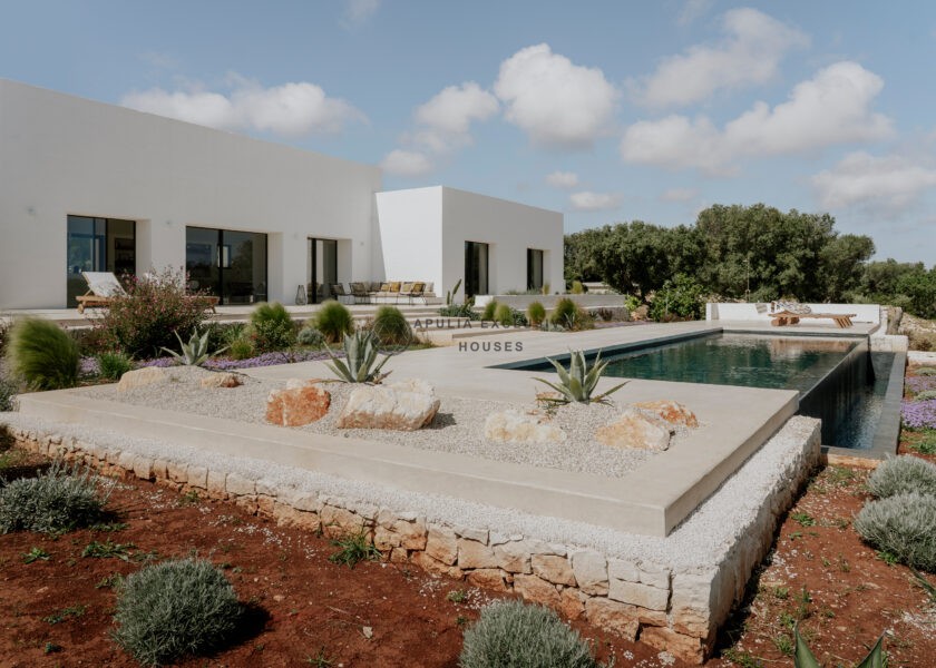 Curated by Apulia Exclusive Houses, the villa showcases a refined architectural style, where clean lines meet natural materials in perfect harmony. Expansive glass walls flood the interiors with sunlight and blur the boundary between indoors and out, creating a serene and elegant atmosphere.