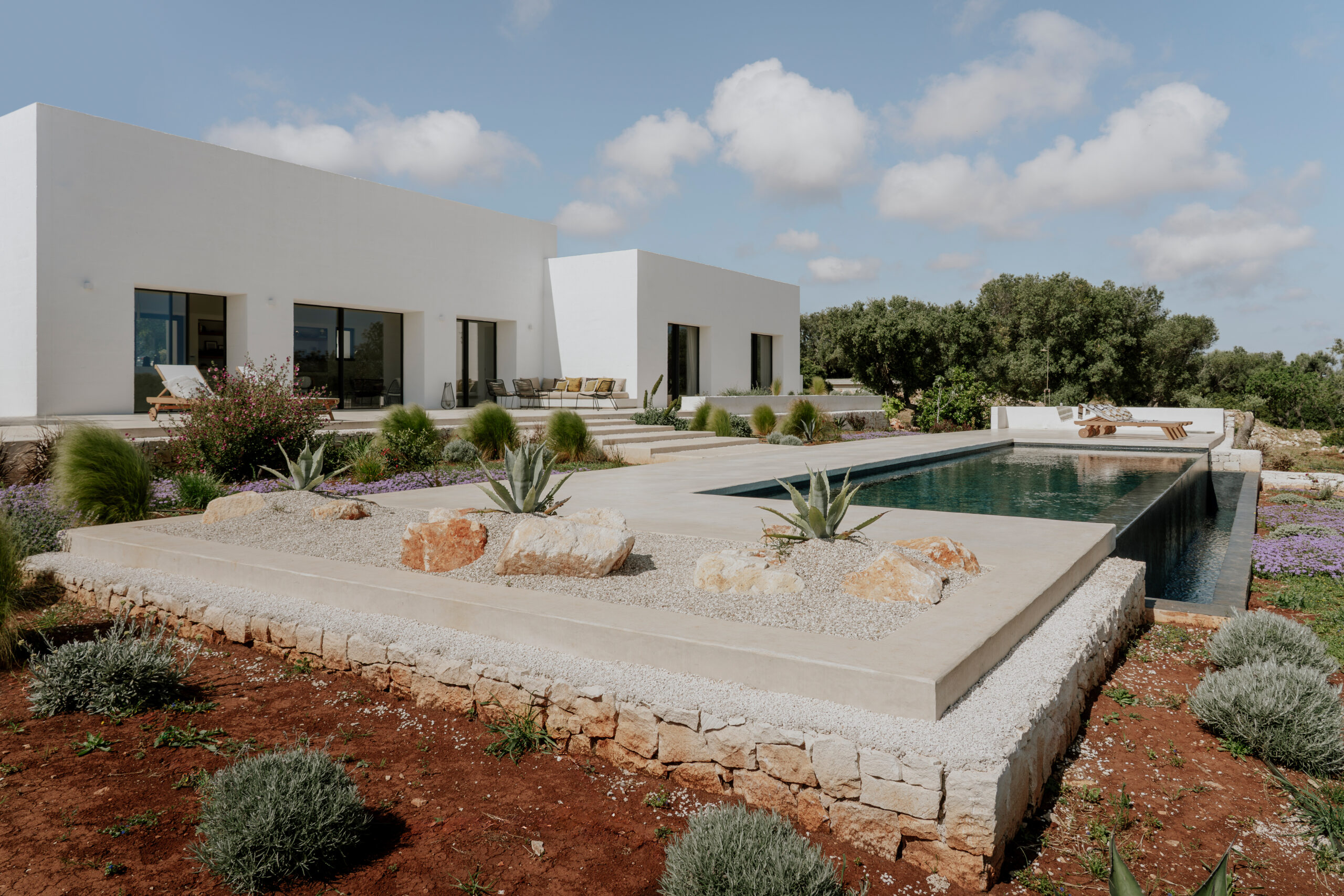 Outside, a lush Mediterranean garden of agaves, lavender and aromatic shrubs surrounds an elegant infinity pool, inviting guests to relax in an oasis of calm and natural beauty.