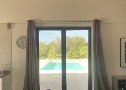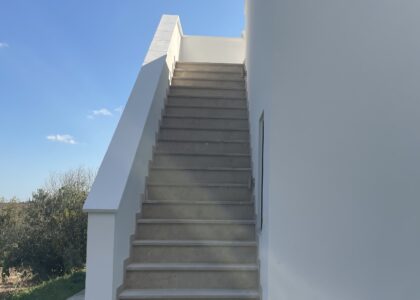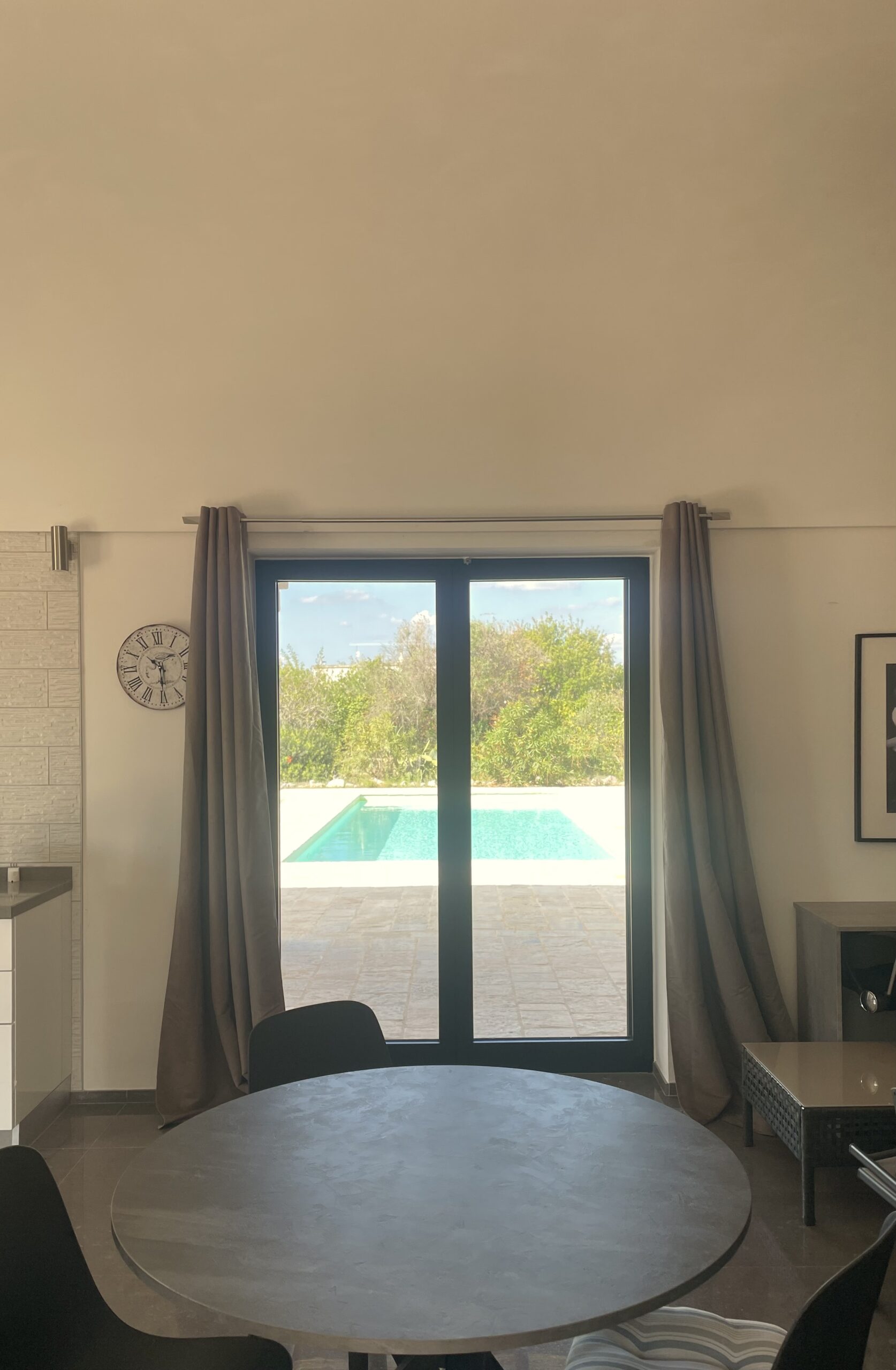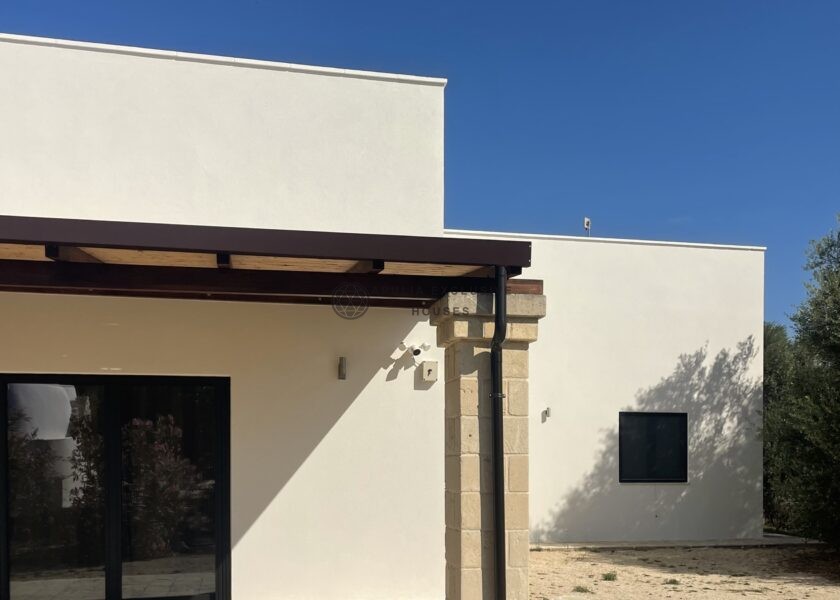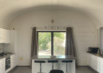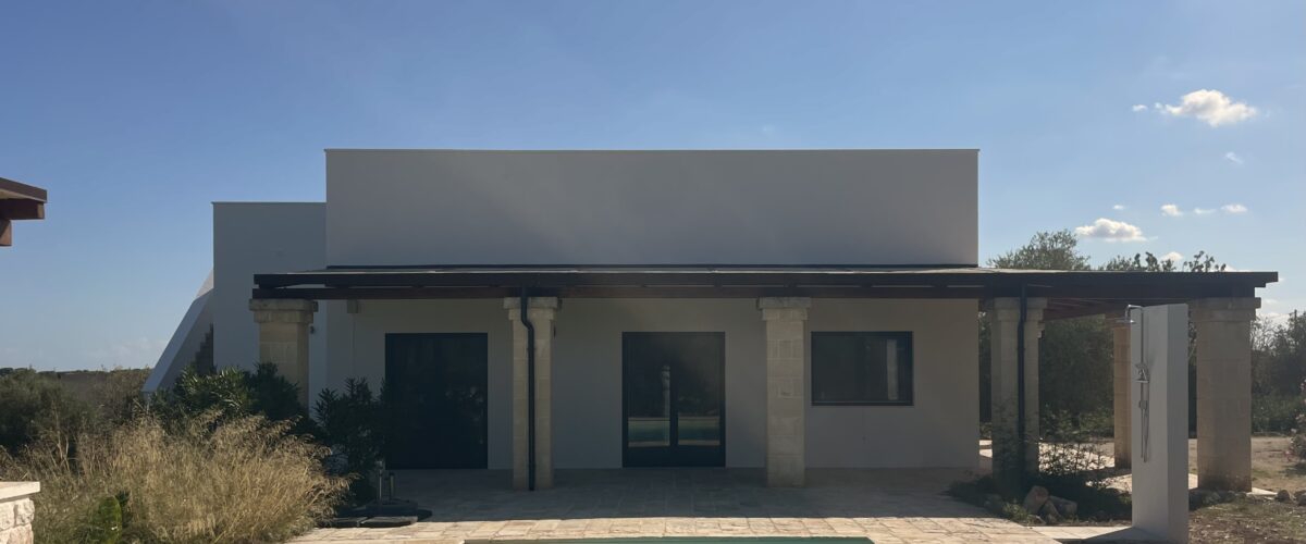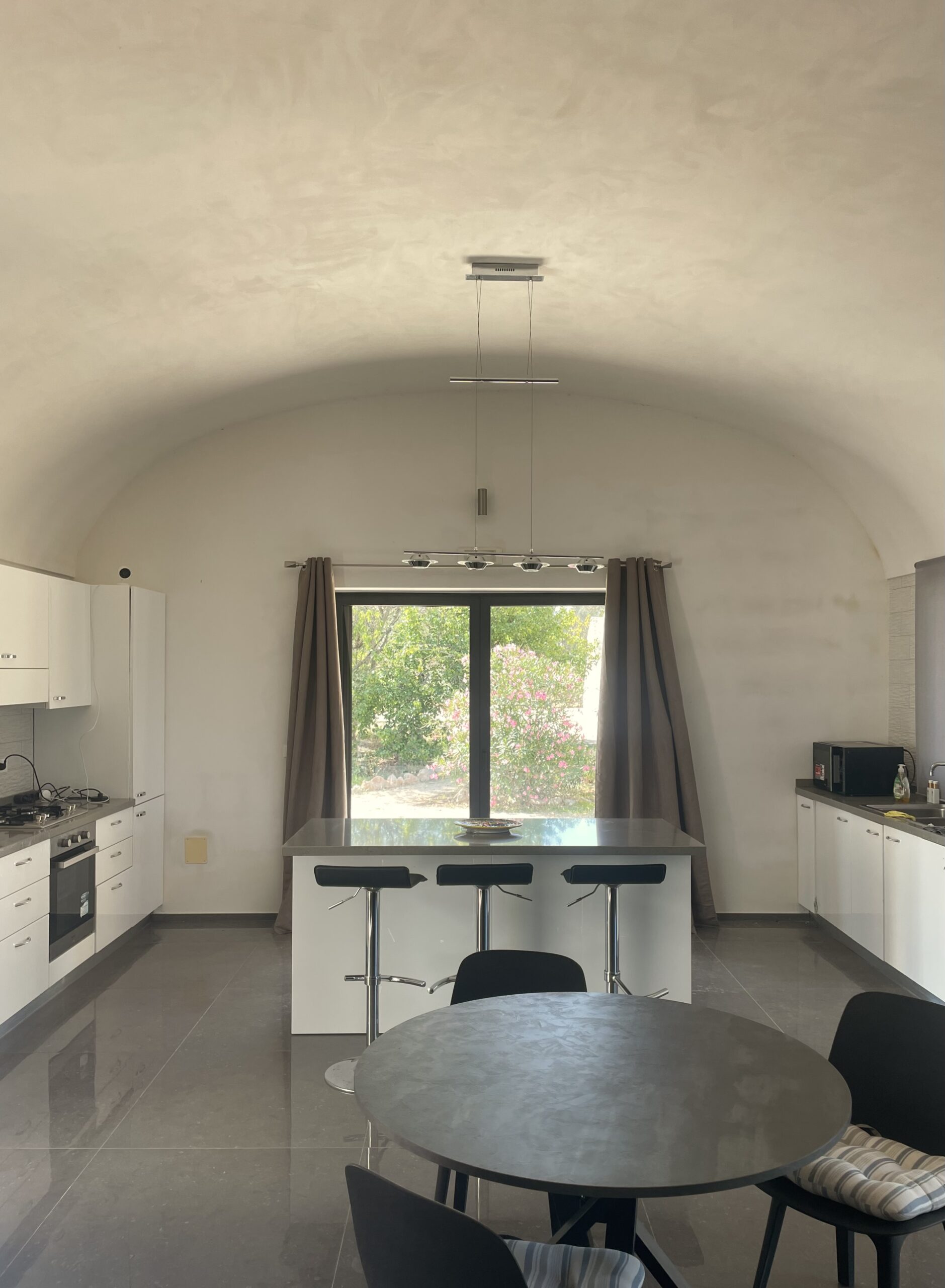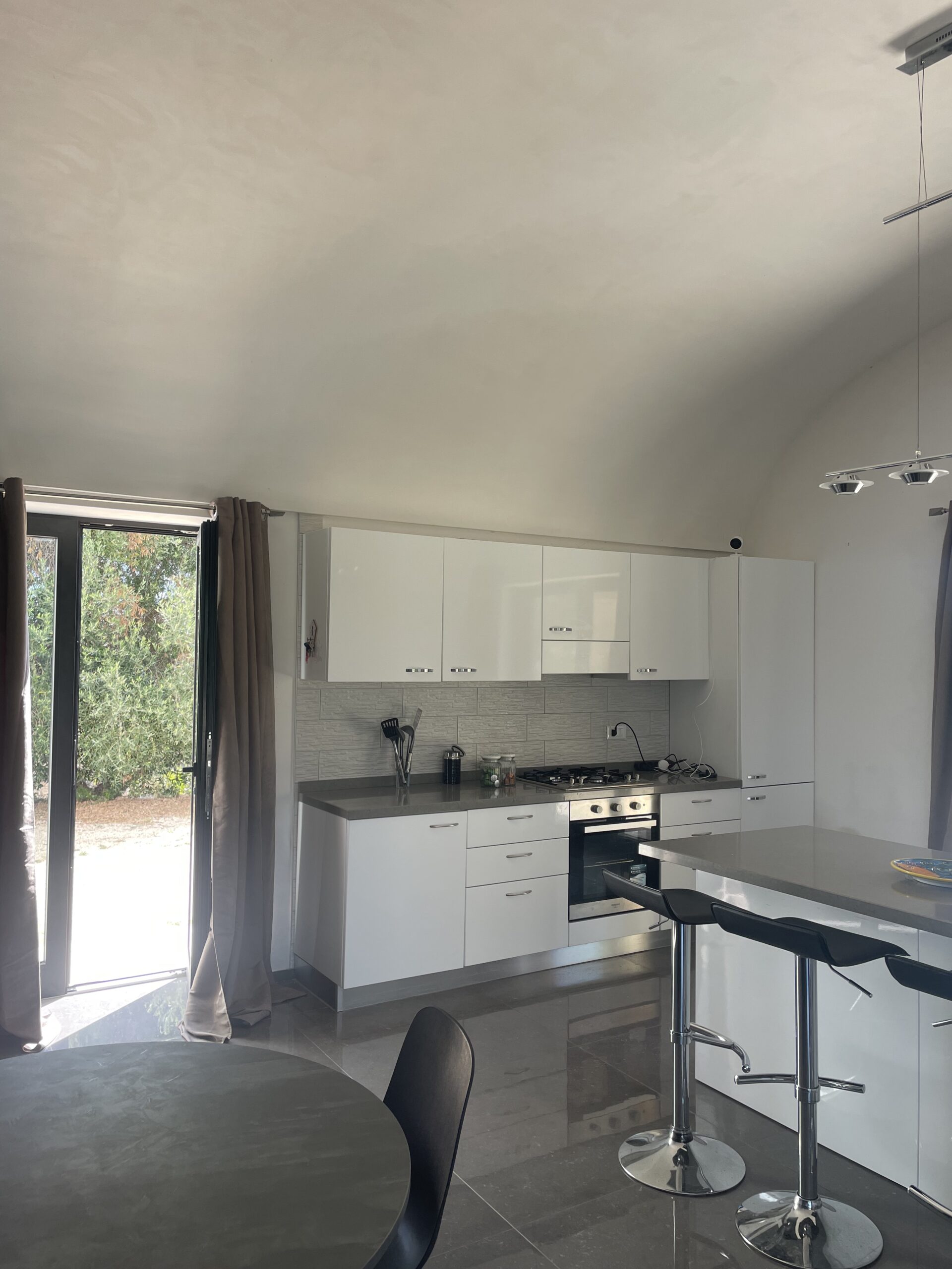 La residenza nasce dall’incontro armonico tra architettura tradizionale pugliese e comfort contemporaneo. Il trullo in pietra, finemente restaurato, convive con la villa moderna creando un insieme elegante e funzionale. Linee pulite, ambienti luminosi e materiali autentici — pietra locale, legno naturale e toni neutri — definiscono un’estetica mediterranea sobria e accogliente. Le ampie aperture mettono in dialogo gli interni con il paesaggio circostante, trasformando ogni scorcio in un quadro rurale.