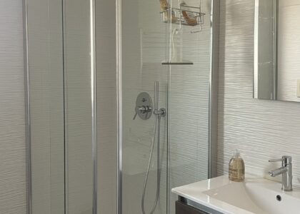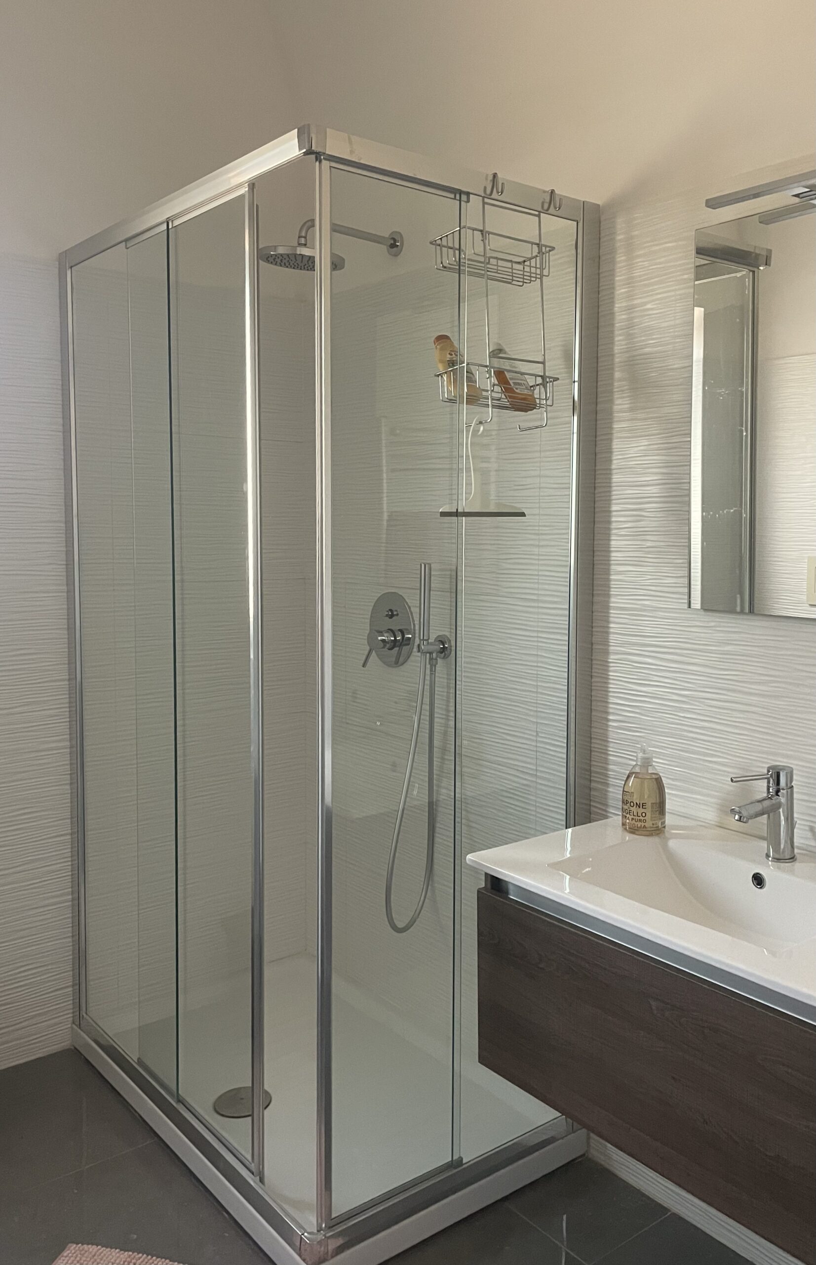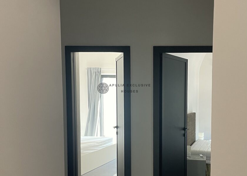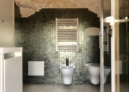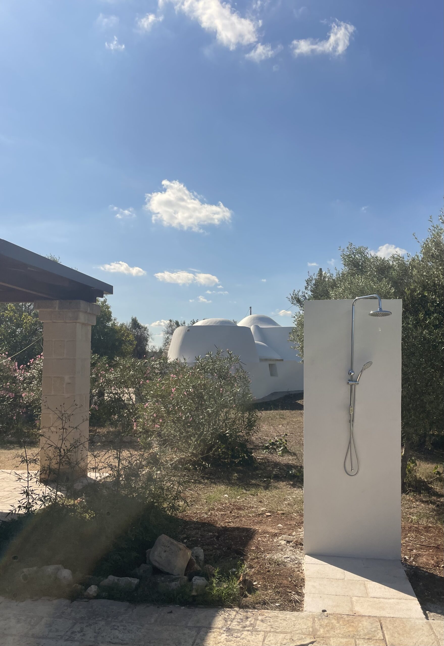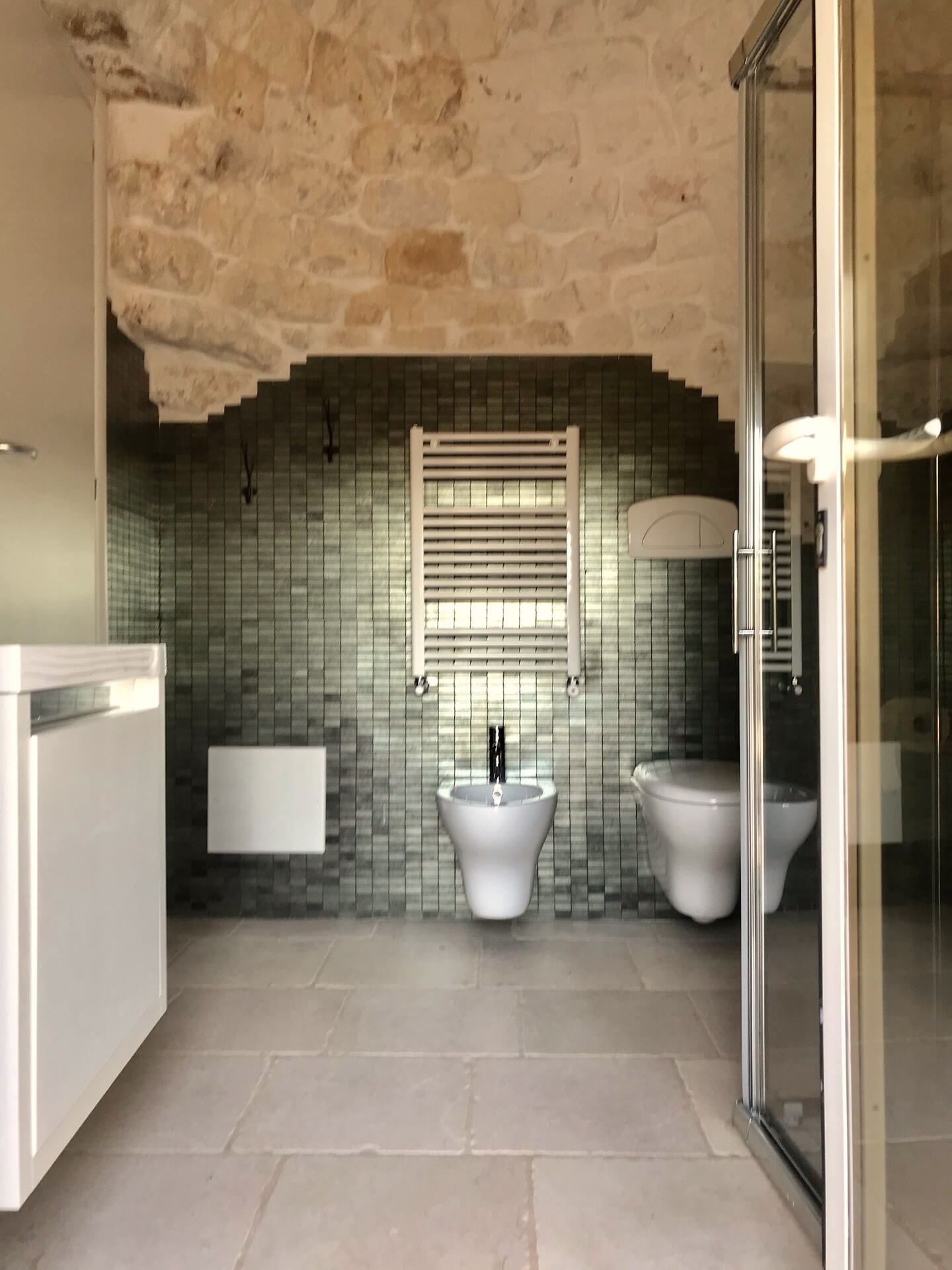 • Due bagni moderni, con docce walk-in e dettagli essenziali in stile pugliese contemporaneo.