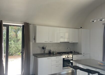 Il cuore della villa è lo spazio living, progettato per unire funzionalità e atmosfera. La cucina open space è caratterizzata da superfici in materiali naturali e arredi minimal, mentre il soggiorno, inondato di luce, si apre verso l’esterno creando una continuità perfetta per la vita quotidiana e la convivialità.